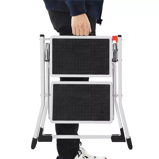 In And OutdoorMatch Klapptritt Shania – mit 2 Stufen – Tritthocker – Leiter – 20 cm breite Stufen – mit rutschfesten Gummimatten – mit Tragegriff – Belastbarkeit bis 150 kg – aus Stahl – Grau/Schwarz