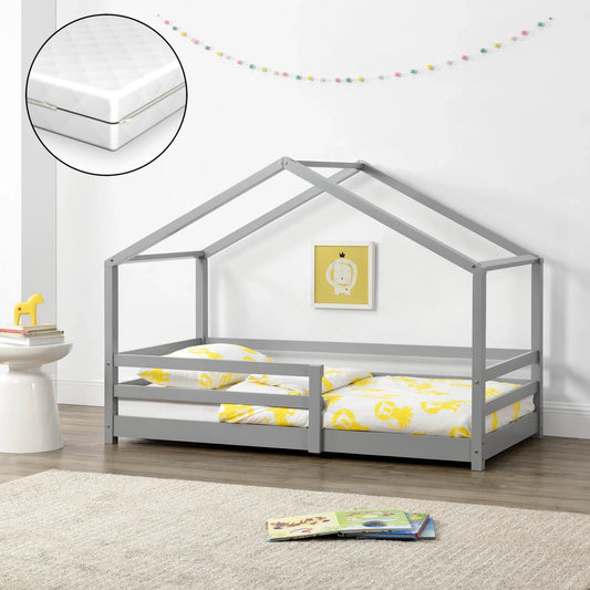 In And OutdoorMatch Kinderbett Toni - Kiefer - Hausbett - Mit Matratze und Fallschutz - 70x140 cm - Hellgrau - Für Mädchen - Für Jungen - Für Kinder