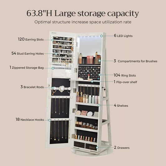 In And OutdoorMatch Spiegelschrank Ayden – Schmuckschrank mit Spiegel – Innenbeleuchtung – mit rahmenlosem Ganzkörperspiegel – 3 Ablagen, 360 drehbar, abschließbar, weiß mit Holzmaserung