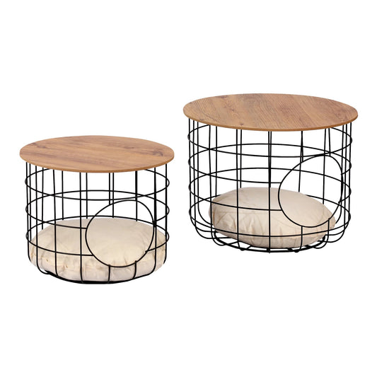 In And OutdoorMatch Beistelltisch Germin - Rund - 2er-Set - Schwarz und Holzfarben - Metall und MDF