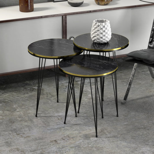 In And OutdoorMatch Beistelltisch Nordin – 3er-Set – rund – Marmor schwarz und schwarz – Spanplatte und Metall – stilvolles Design