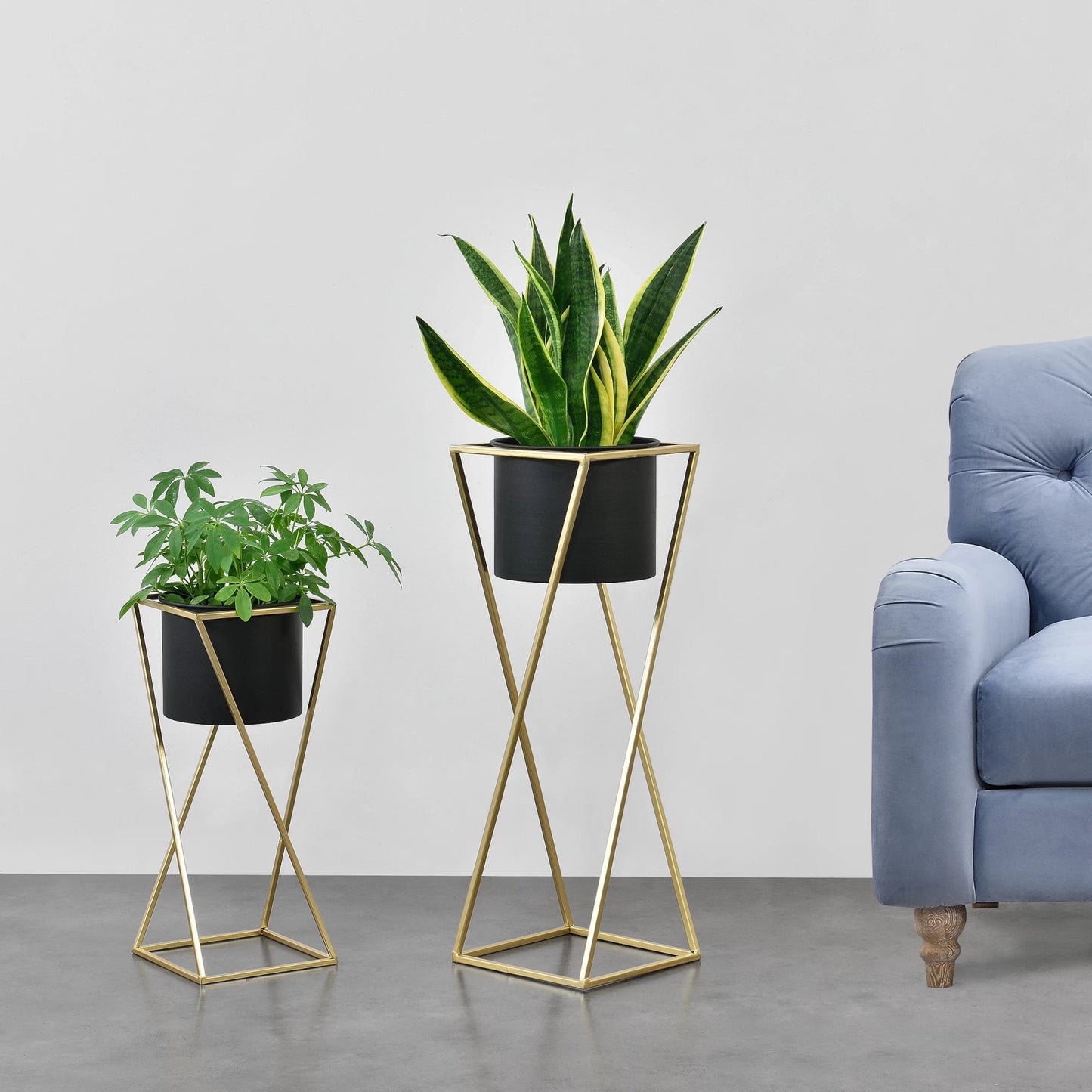 In And OutdoorMatch Blumentopf Alana – Auf Ständer – Metall – 2er-Set – Schwarz und Goldfarben – Stilvolles Design