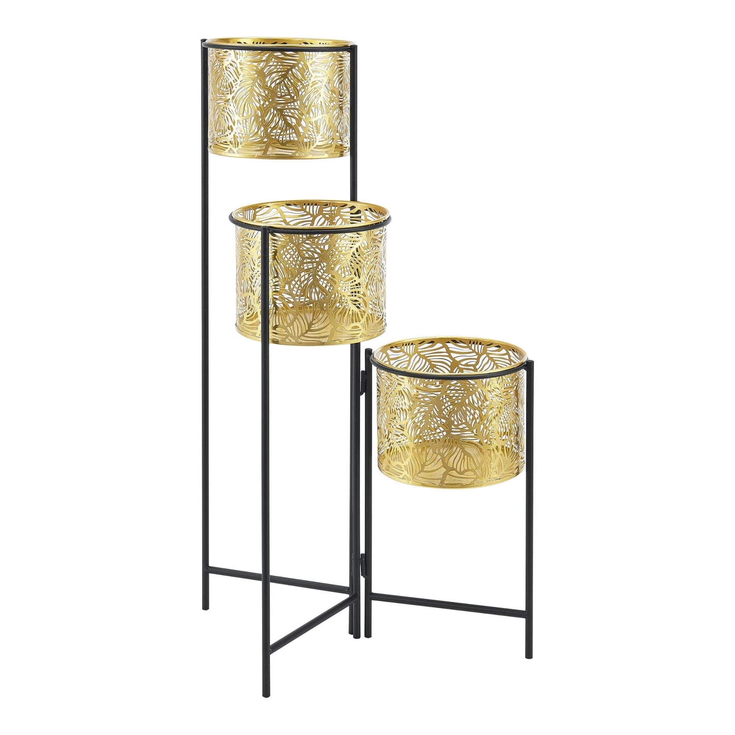 In And OutdoorMatch Blumentopf Vincenza – Auf Ständer – Schwarz und Messing – Metall – 3er-Set – Faltbar – Modernes Design