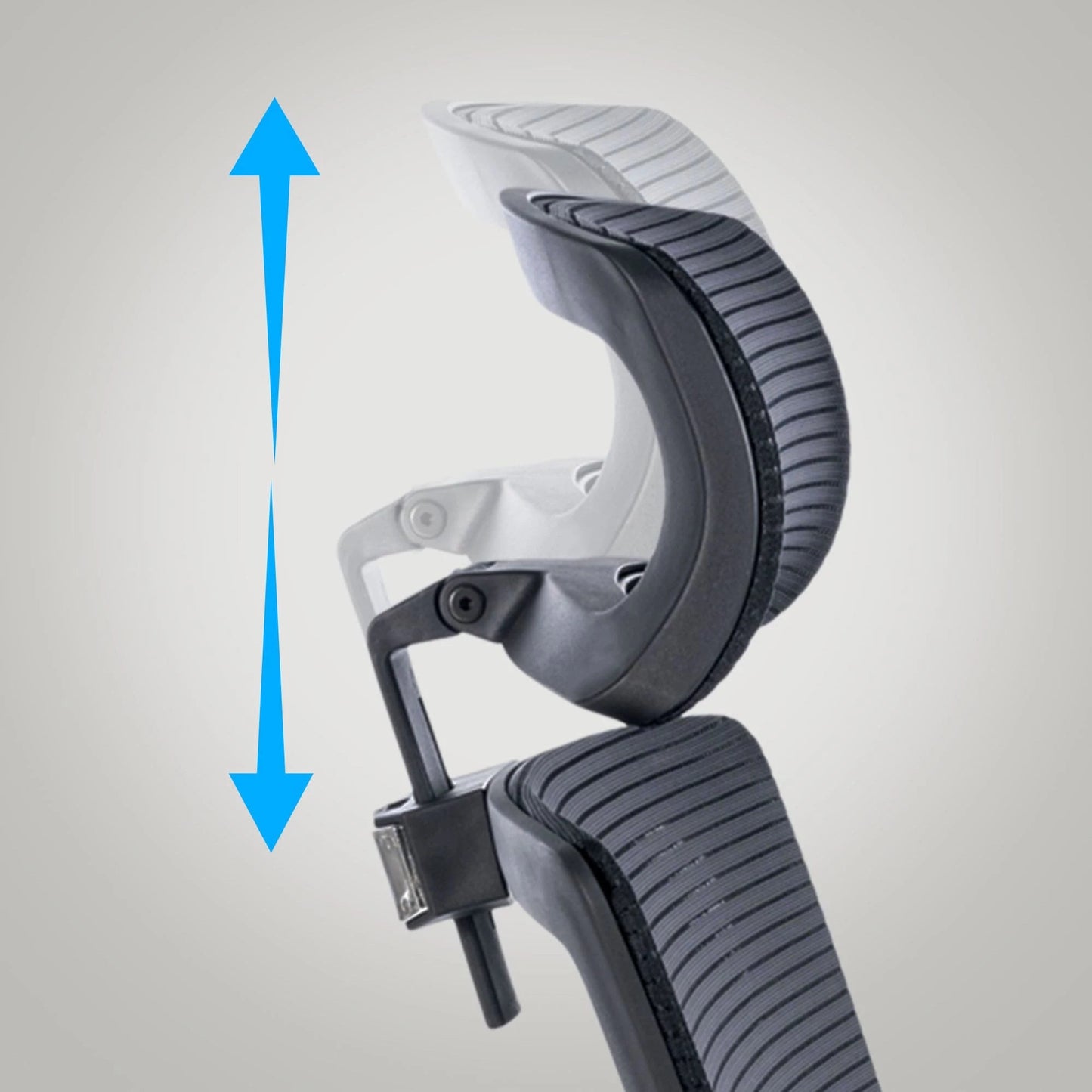 Der Drehstuhl verfügt über mehrere komfortable Features, wie die höhenverstellbare Kopfstütze und die in die Rückenlehne integrierte Lordosenstütze, die den unteren Rücken stützt. Die umlaufenden Armlehnen entlasten Nacken und Schultern.