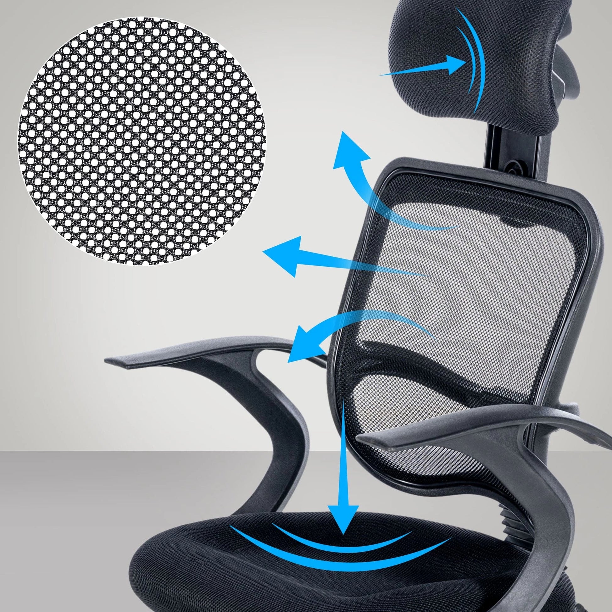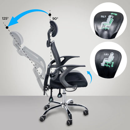 Der Stuhl lässt sich optimal an die individuellen körperlichen Anforderungen anpassen. Die Kopfstütze ist in Höhe und Winkel verstellbar. Die mit einem atmungsaktiven Netzbezug versehene Rückenlehne ist zudem höhenverstellbar und die Rundung im Lendenwirbelbereich stützt den unteren Rücken. Die Rückenlehne verfügt außerdem über eine Kipp- und Feststellfunktion, die eine Neigung der Rückenlehne bis zu 125 Grad ermöglicht. Die Armlehnen entlasten letztendlich den Nacken und die Schultern.