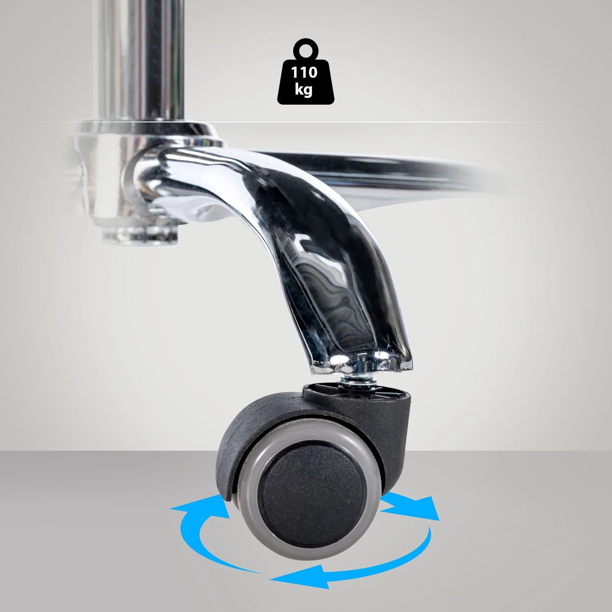 Sowohl die Sitzfläche als auch die Kopfstütze sind mit robustem und pflegeleichtem Stoff bezogen, während der Stuhl auf einem stabilen Metallgestell in Chromoptik steht. Dank der BIFMA-zertifizierten Gasfeder ist der Bürostuhl höhenverstellbar. Der Drehstuhl hat eine maximale Belastbarkeit von 110 kg.