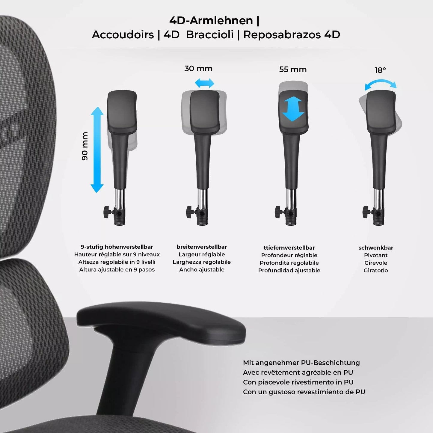 Der üppige Sitz hat eine Rundung, die die Last gleichmäßig auf Oberschenkel und Gesäß verteilt. Schließlich entlasten die 4D-Armlehnen den Schulter- und Nackenbereich. 4D steht in diesem Zusammenhang für vierdimensionale Verstellbarkeit: Neben der Höhen- und Tiefenverstellung lassen sich die Armlehnen drehen und in der Breite verstellen.