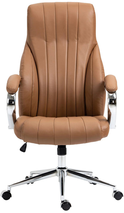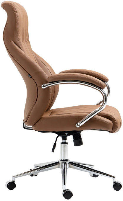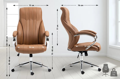 Dieser exklusive Bürostuhl überzeugt nicht nur durch sein modernes Erscheinungsbild, auch in puncto Komfort macht ihm niemand etwas vor. Die hochwertige Füllung sorgt für ein angenehmes Sitzgefühl über mehrere Stunden. Für die Sitz- und Rückenlehnenpolsterung wurde hochwertiges Rindsleder verwendet. Die Rückenlehne hat eine angenehme S-Form und die Sitzhöhe ist stufenlos verstellbar und garantiert ergonomisches Sitzen. Darüber hinaus ist der Bürostuhl mit einer Wippmechanik ausgestattet, die für mehr Bewegungsfreiheit sorgt. Stabilität wird durch das Metallgestell in Chromoptik gewährleistet. Dank der fünf leichtgängigen Rollen rollen Sie leicht und locker über den Boden – sowohl auf Hartböden als auch auf Teppichen.