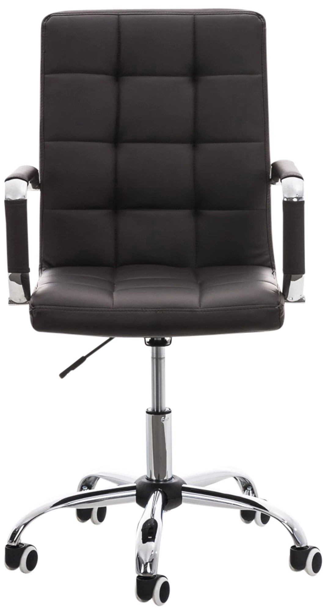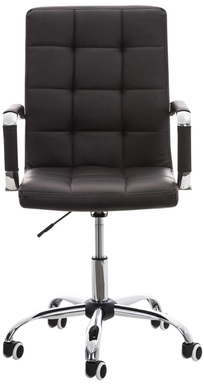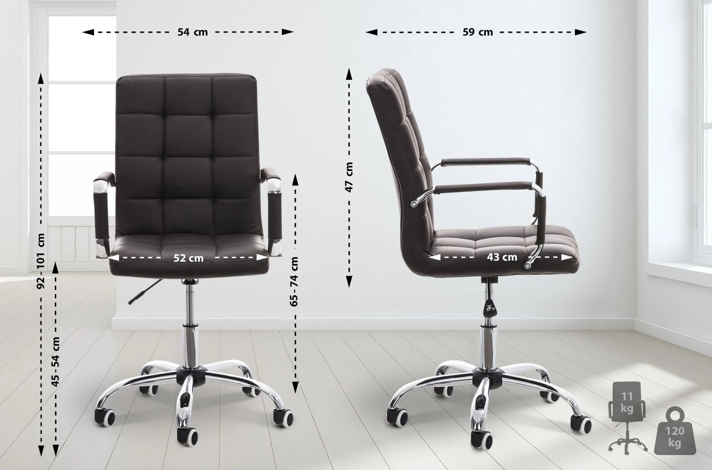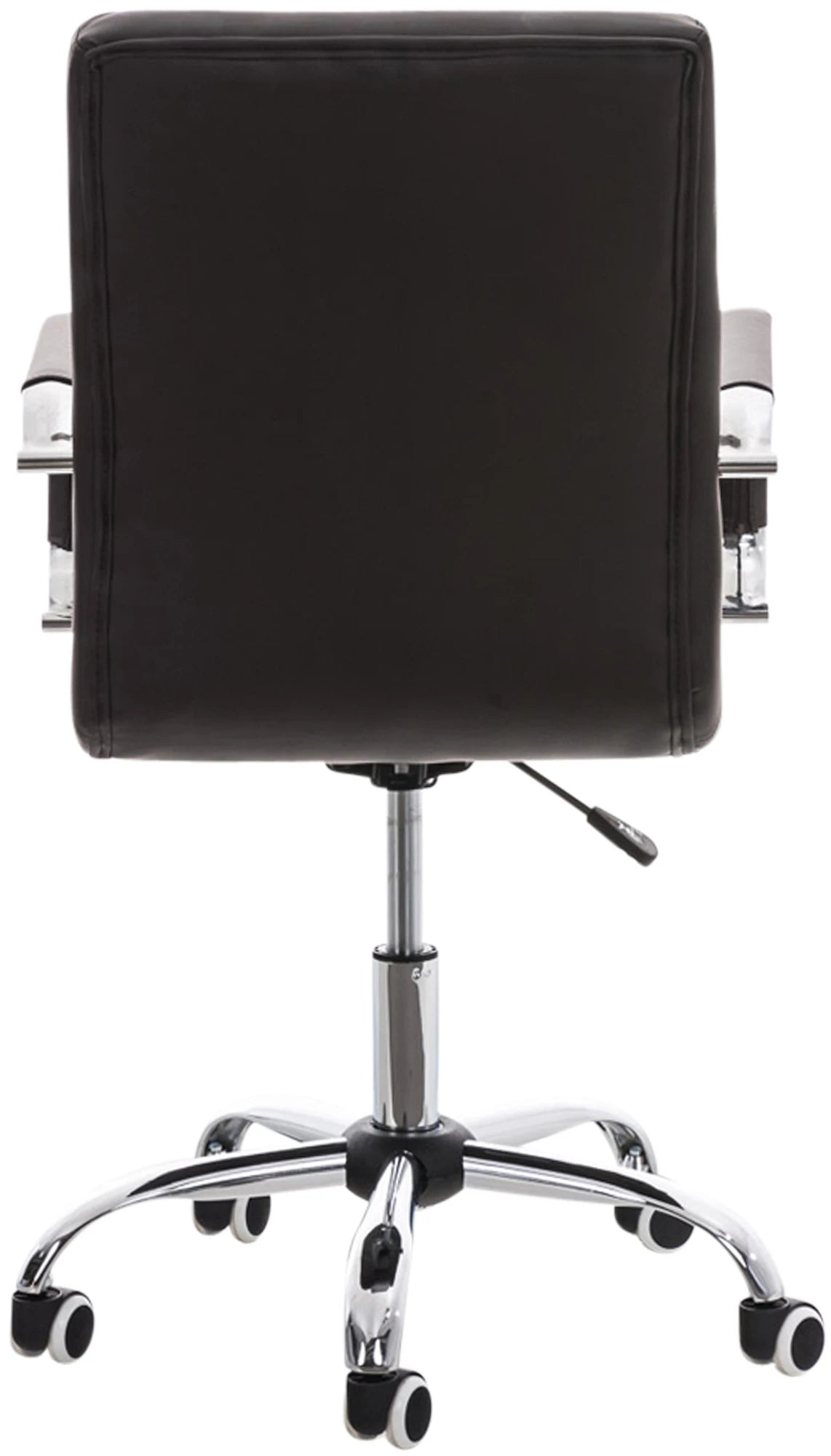 Der Bürostuhl Jessamyn überzeugt durch sein modernes Design und bietet dank der Rückenlehne hohen Komfort beim Arbeiten. Dieser exklusive Jessamyn-Bürostuhl verfügt über eine sehr hochwertige Füllung und Kunstlederpolsterung. Kunstlederbezüge haben den Vorteil, dass sie elastisch sind und sich bei Entlastung wieder geschmeidig dehnen. Das sieht nicht nur schöner aus, sondern verlängert auch die Lebensdauer des Sitzbezugs. Das Gestell besteht aus Metall in Chromoptik und ist daher sehr stabil. Dank der verstellbaren Sitzhöhe ist ergonomisches Sitzen gewährleistet. Die Sitzhöhe ist über den Hebel unter dem Sitz stufenlos verstellbar. Der Bürostuhl steht sicher auf fünf leichtgängigen Rollen. Ob Hartboden oder Teppich, Sie können immer leicht und locker über den Boden rollen.