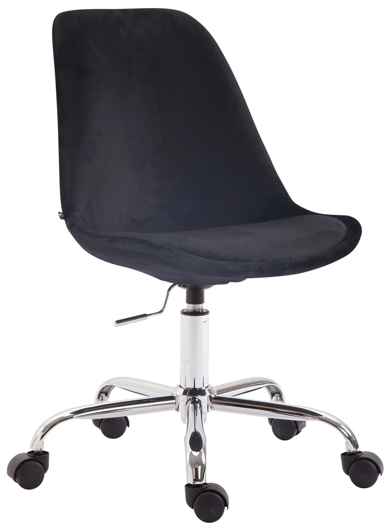 Dieser Bürostuhl sieht durch den Materialmix aus Samt und Metall in Chromoptik einfach stilvoll aus und überzeugt durch seine Funktionalität. Dank seines praktischen Designs eignet er sich auch für kleinere Räume. Der gepolsterte Sitz ist mit Samtpolsterung bezogen und die stufenlos verstellbare Sitzhöhe ermöglicht ergonomisches Sitzen. Er steht sicher auf fünf leichtgängigen Rollen und einem Metallgestell in Chromoptik. Egal ob Hartboden oder Teppich, Sie rollen leicht und locker über den Boden.