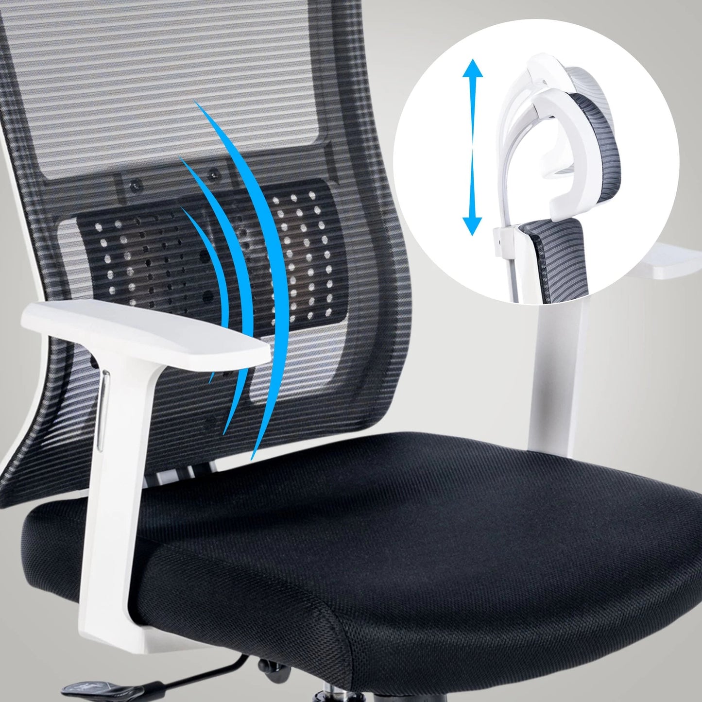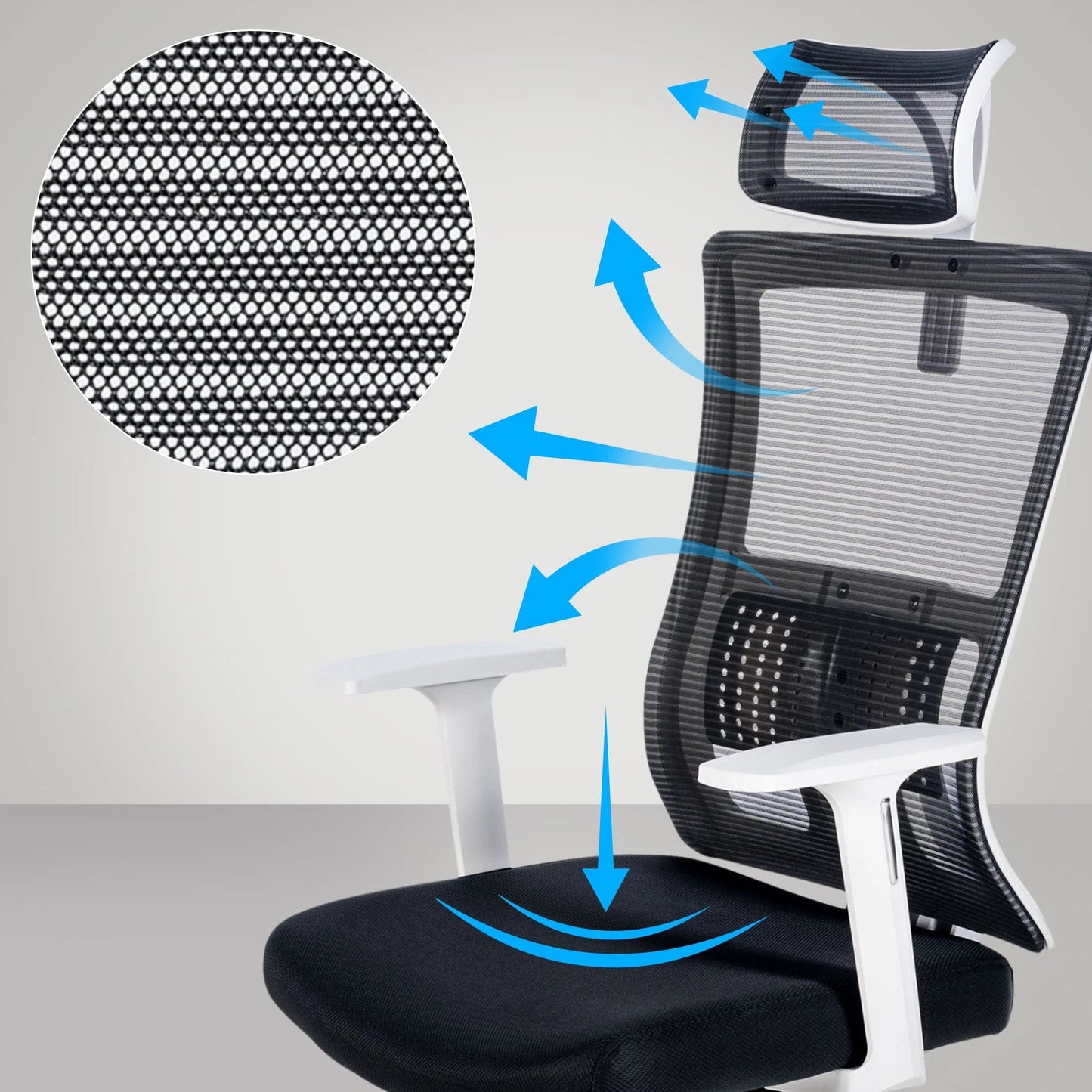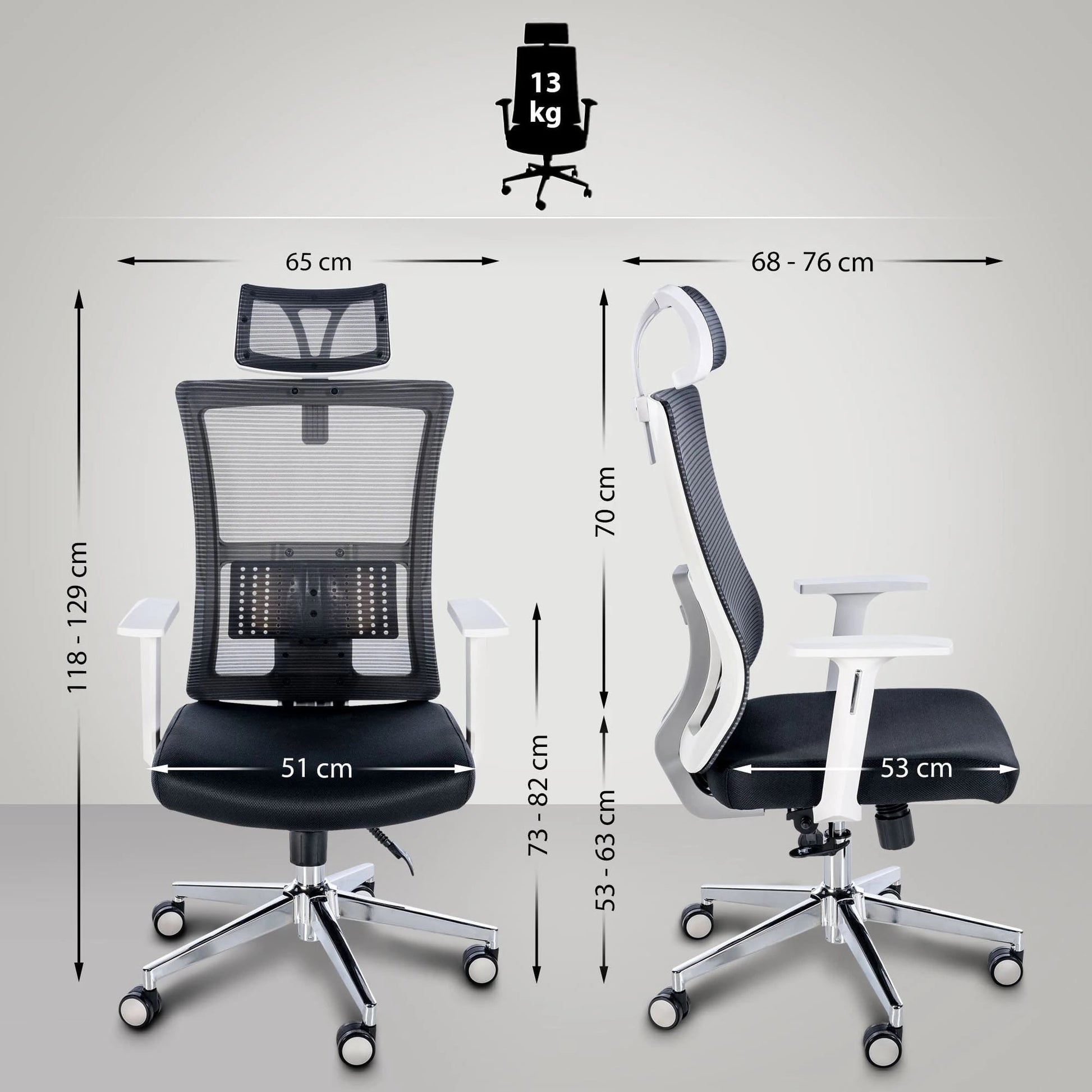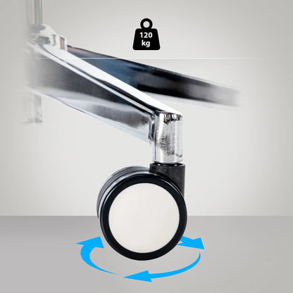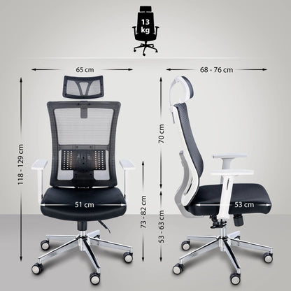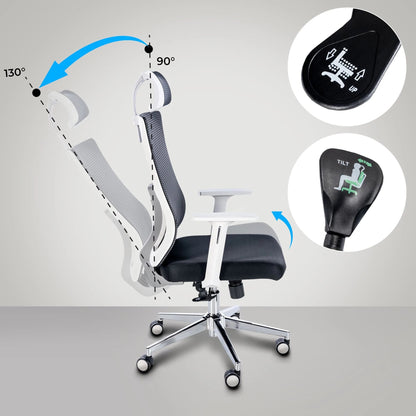Seinen außergewöhnlichen Komfort verdankt der Drehstuhl den zahlreichen ergonomischen Features: Die Rückenlehne verfügt über eine Neigefunktion mit Synchronmechanik, die eine Neigung der Rückenlehne um bis zu 130 Grad ermöglicht. Die Rückenlehne lässt sich in drei Positionen fixieren und die Neigungsspannung einstellen. Die Position der Lordosenstütze ist verstellbar und die höhenverstellbare Kopfstütze und Armlehnen entlasten Nacken und Schultern. Der Drehstuhl ist über den BIFMA-zertifizierten Gaslift höhenverstellbar. Für noch mehr Komfort sorgt der atmungsaktive Netzbezug der Rückenlehne und Kopfstütze, während die gepolsterte Sitzfläche mit robustem Stoff bezogen ist. Das äußerst robuste Metallgestell in Chromoptik mit leichtgängigen Rollen verleiht dem Drehstuhl schließlich einen stabilen Stand. Die maximale Belastbarkeit des Stuhls beträgt 120 kg.