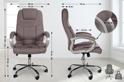 Der Chefsessel Nora ist ein exklusiver Bürostuhl mit sehr hochwertiger Polsterung und Stoffpolsterung. Der Vorteil der Stoffbezüge besteht darin, dass sie elastisch sind und sich bei Entlastung wieder geschmeidig dehnen. Das sieht nicht nur schöner aus, sondern verlängert auch die Lebensdauer des Sitzbezugs. Das Gestell besteht aus Metall in Chromoptik und ist daher sehr stabil. Dank der verstellbaren Sitzhöhe ist ergonomisches Sitzen gewährleistet. Die Sitzhöhe ist über den Hebel unter dem Sitz stufenlos verstellbar. Der eingebaute Wippmechanismus sorgt für mehr Bewegungsfreiheit. Der Bürostuhl steht sicher auf fünf leichtgängigen Rollen. Ob Hartboden oder Teppichboden, Sie können immer leicht und locker über den Boden rollen.