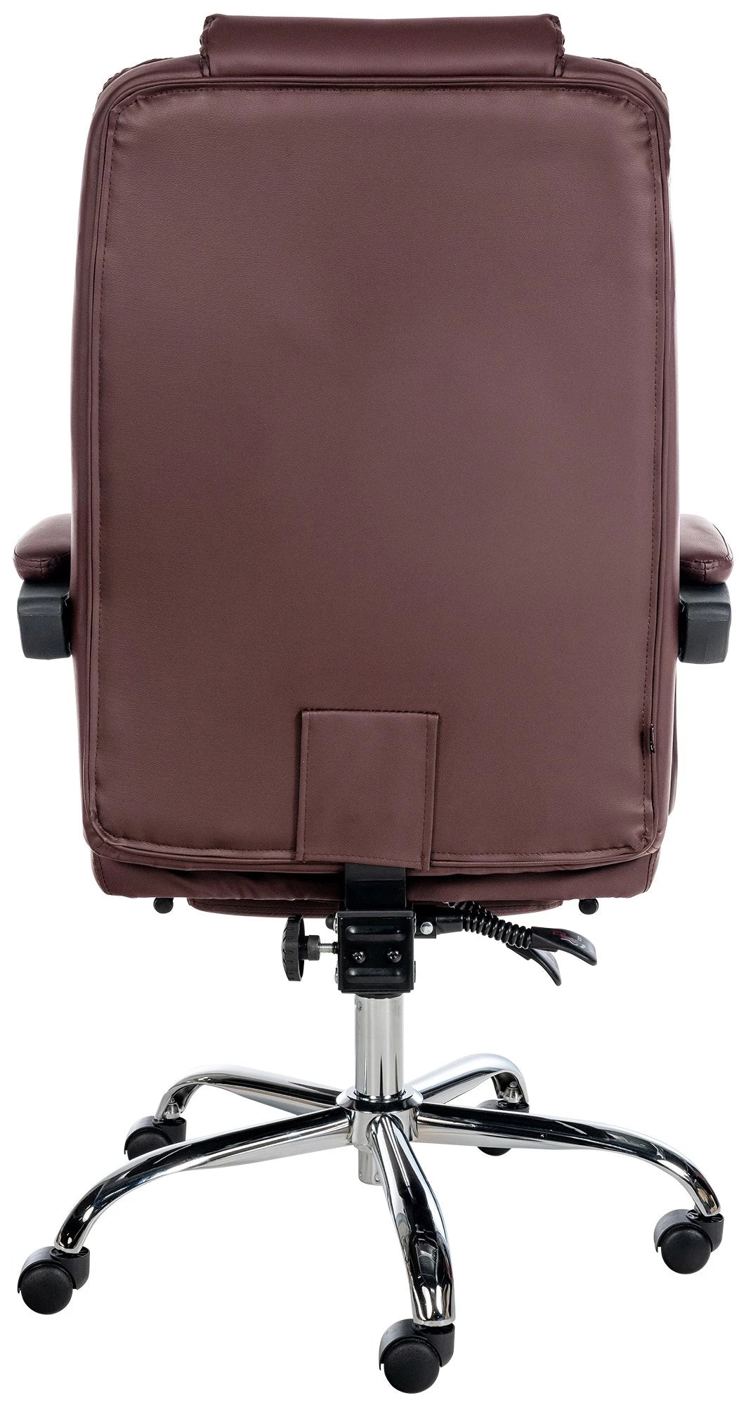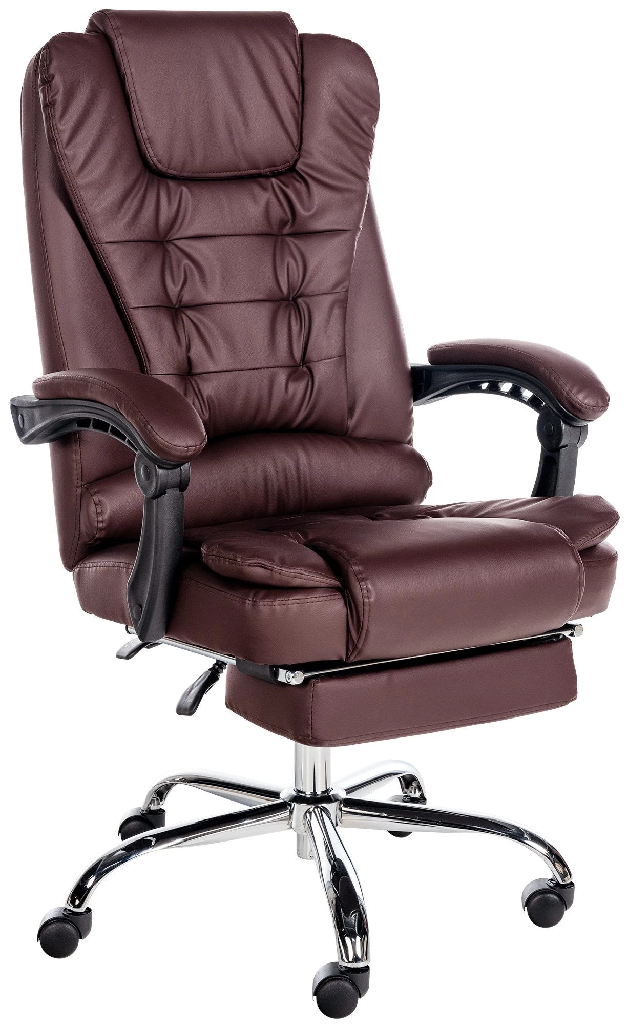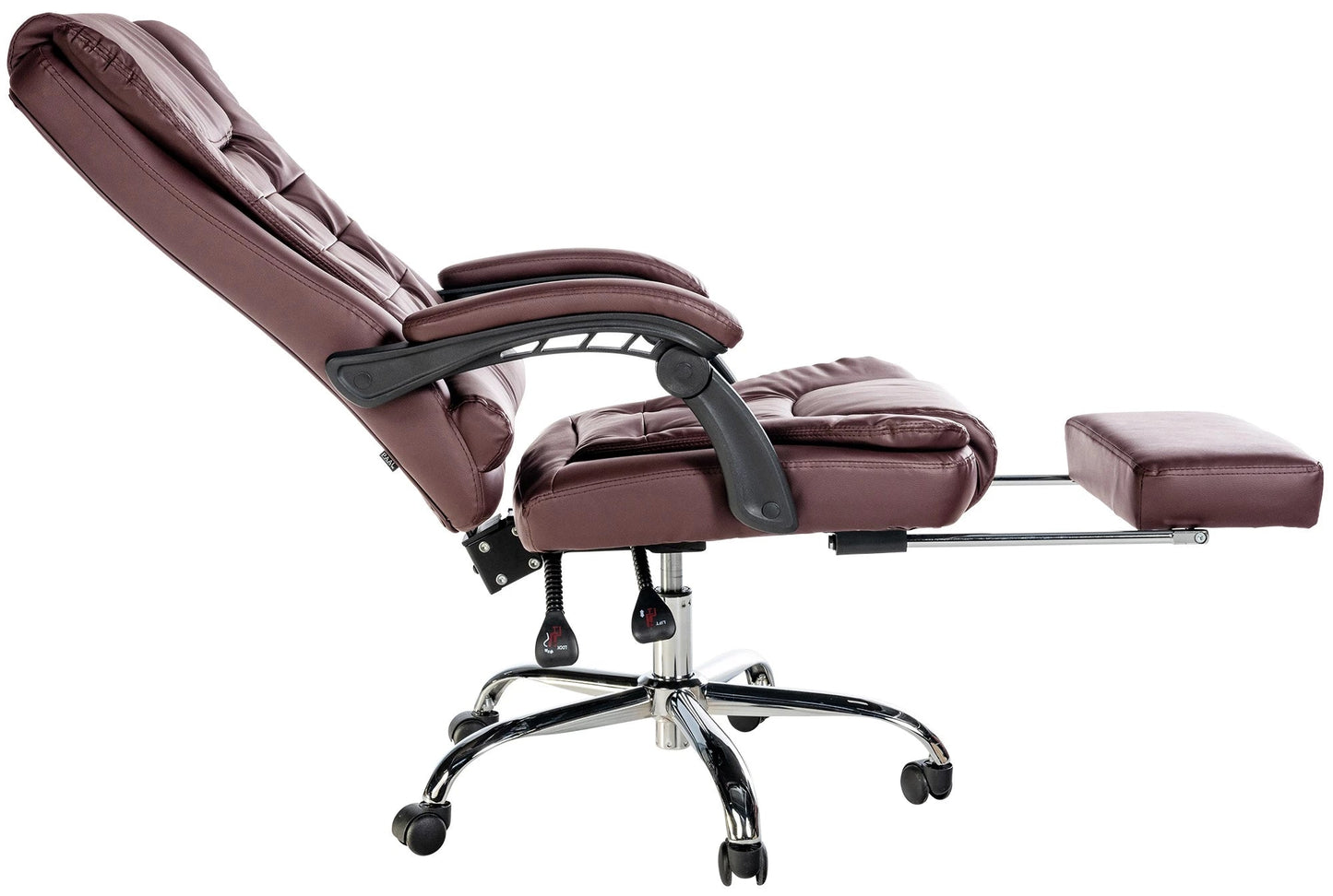 Dank der leicht verstellbaren Fußstütze und Rückenlehne können Sie sich entspannt zurücklehnen und gleichzeitig die Beine hochlegen. Der Bürostuhl ist stufenlos höhenverstellbar, sodass er genau an Ihre Körpergröße angepasst werden kann. Für mehr Bewegungsfreiheit lässt sich der Stuhl um 360 Grad um die eigene Achse drehen. Er steht sicher auf fünf leichtgängigen Rollen und einem Metallgestell in Chromoptik.