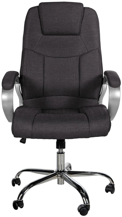 Der Chefsessel Roy ist ein exklusiver Bürostuhl mit sehr hochwertiger Polsterung und Stoffpolsterung. Der Vorteil der Stoffbezüge besteht darin, dass sie elastisch sind und sich bei Entlastung wieder geschmeidig dehnen. Das sieht nicht nur schöner aus, sondern verlängert auch die Lebensdauer des Sitzbezugs. Das Gestell besteht aus Metall in Chromoptik und ist daher sehr stabil. Dank der verstellbaren Sitzhöhe ist ergonomisches Sitzen gewährleistet. Die Sitzhöhe ist über den Hebel unter dem Sitz stufenlos verstellbar. Der eingebaute Wippmechanismus sorgt für mehr Bewegungsfreiheit. Der Bürostuhl steht sicher auf fünf leichtgängigen Rollen. Ob Hartboden oder Teppichboden, Sie können immer leicht und locker über den Boden rollen.