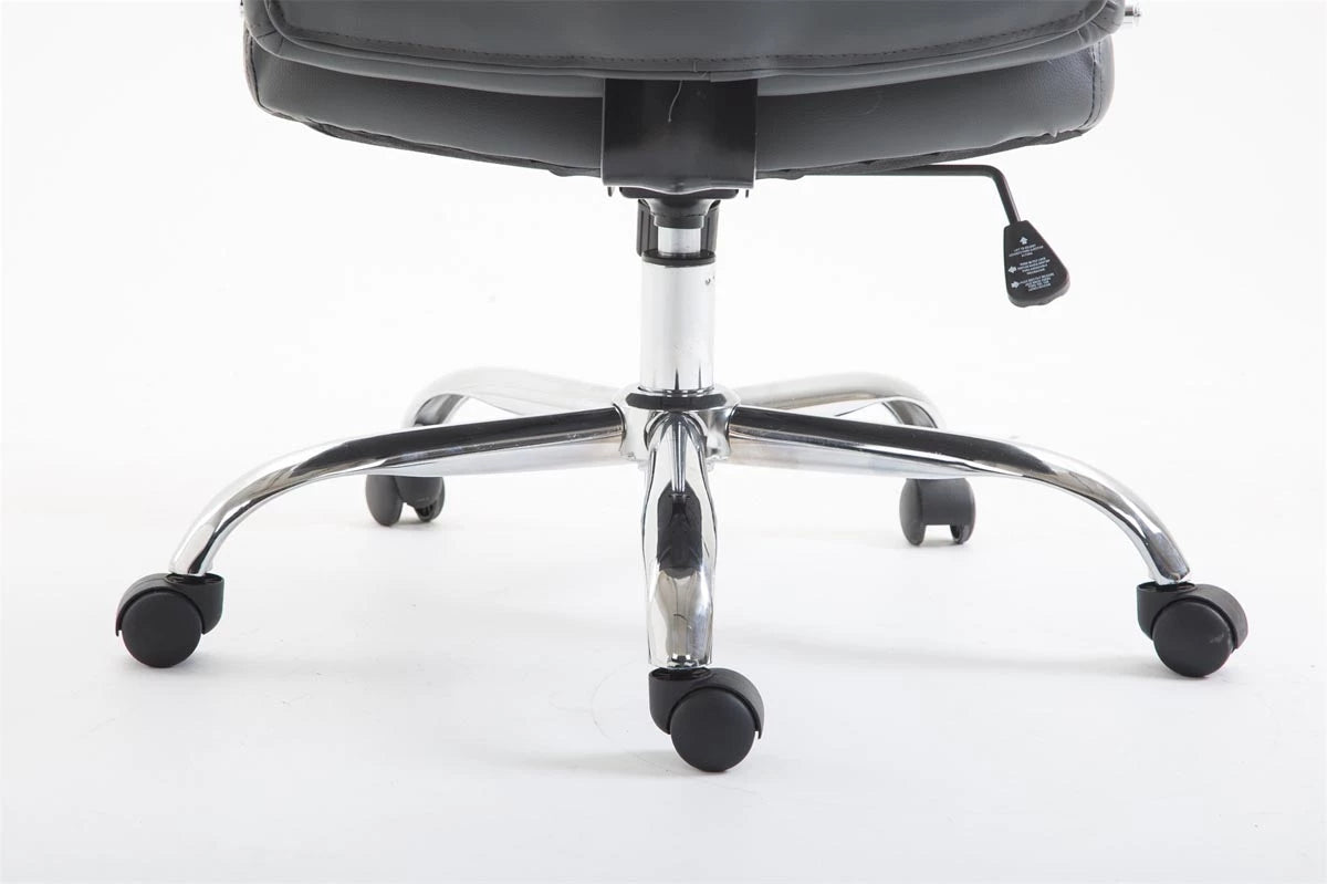 Der Bürostuhl XL Sonny ist ideal für große und schwere Menschen, denn die Gasfeder ist für den Dauereinsatz bis 140 kg ausgelegt. Es handelt sich um einen Bürostuhl mit hochwertiger Polsterung und Kunstlederpolsterung. Kunstlederbezüge haben den Vorteil, dass sie elastisch sind und sich bei Entlastung wieder geschmeidig dehnen. Das sieht nicht nur schöner aus, sondern verlängert auch die Lebensdauer des Sitzbezugs. Über den Hebel unter der Sitzfläche lässt sich die Sitzhöhe stufenlos verstellen, was ein ergonomisches Sitzen garantiert. Der eingebaute Wippmechanismus sorgt zudem für mehr Bewegungsfreiheit. Das Gestell des Bürostuhls besteht aus Metall in Chromoptik. Er steht sicher auf fünf robusten Kunststoffrädern. Ob Hartboden oder Teppichboden, Sie können immer leicht und locker über den Boden rollen.