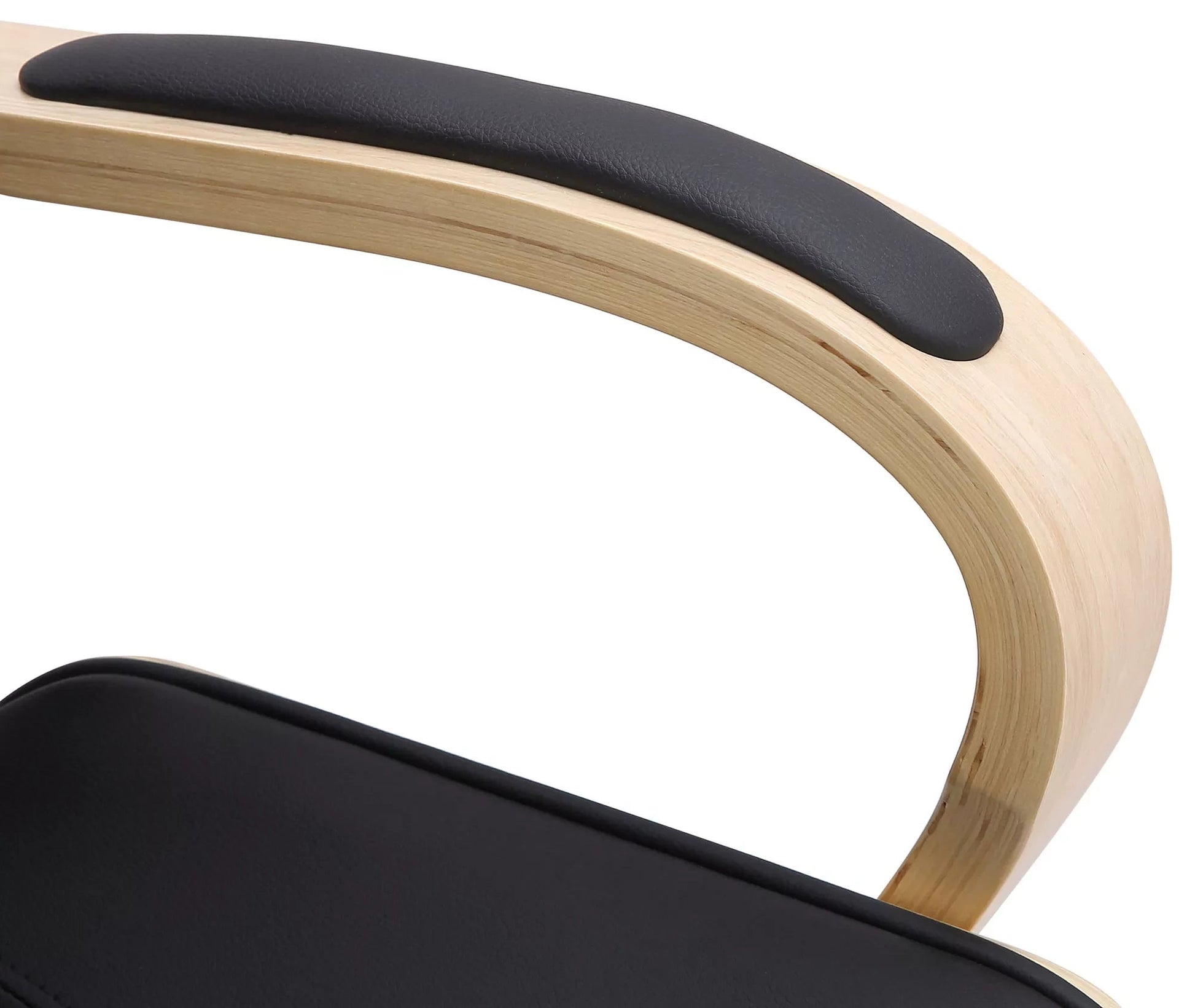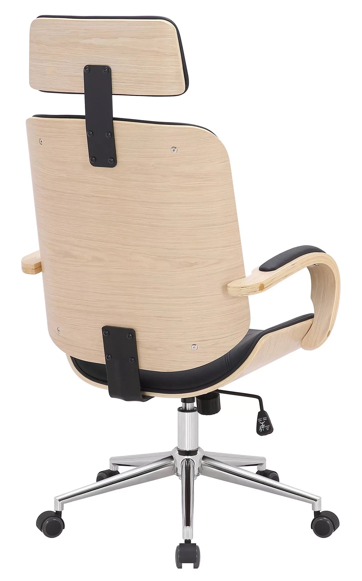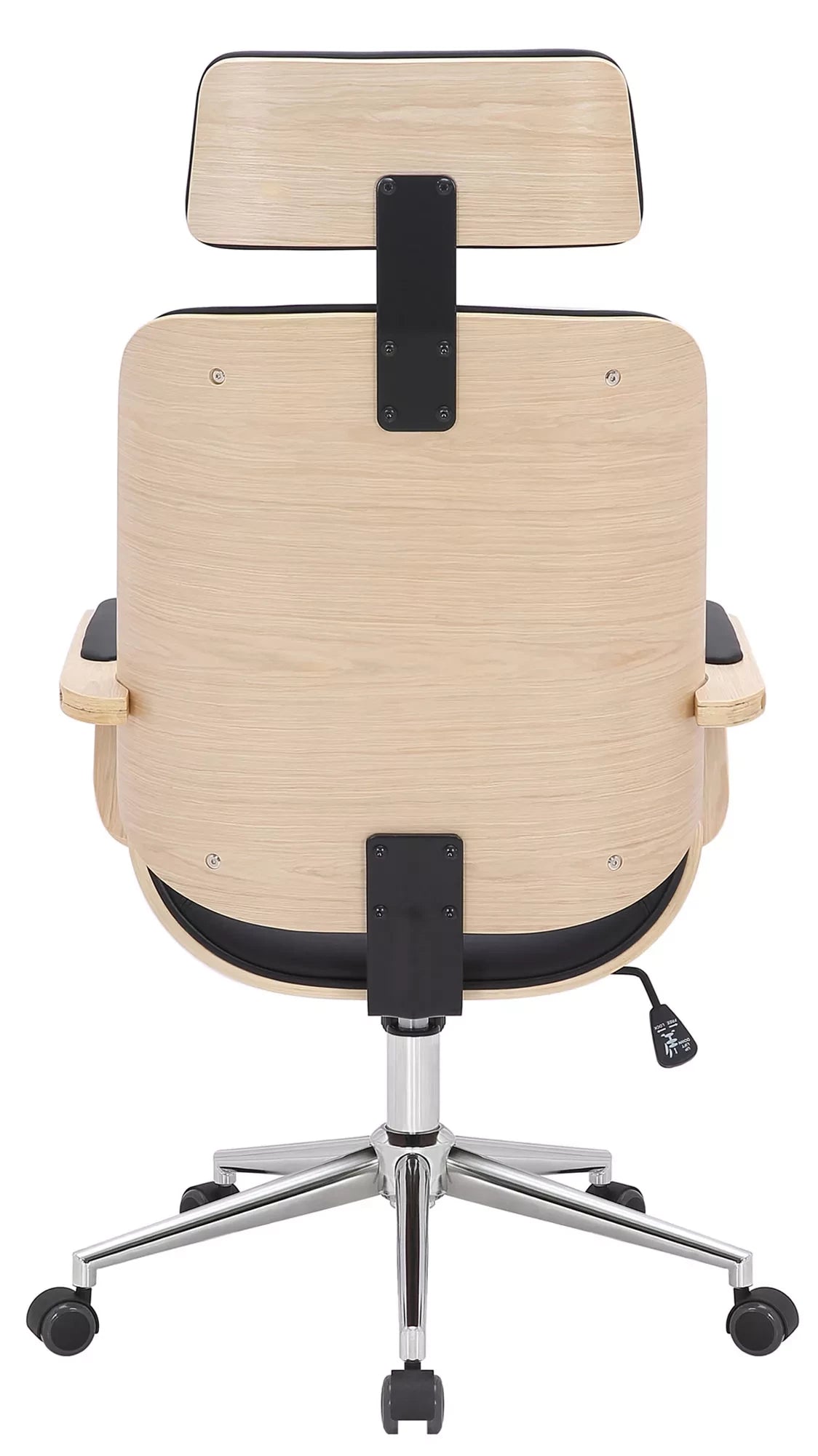 Der Chefsessel Thaddeus ist ein stilvoller Bürostuhl mit einer sehr hochwertigen Polsterung mit Kunstlederpolsterung. Kunstlederbezüge haben den Vorteil, dass sie elastisch sind und sich bei Entlastung wieder aufrichten. Das sieht nicht nur schöner aus, sondern verlängert auch die Lebensdauer des Sitzbezugs. Das geschwungene Holzgestell macht diesen Bürostuhl zum absoluten Hingucker und verleiht ihm ein elegantes Design. Dank der stufenlos verstellbaren Sitzhöhe ist ergonomisches Sitzen gewährleistet und die eingebaute Wippmechanik sorgt für mehr Bewegungsfreiheit. Das Gestell besteht aus Metall in Chromoptik und ist sehr stabil. Der Bürostuhl steht sicher auf fünf leichtgängigen Rollen. Egal ob Hartboden oder Teppich, Sie rollen immer leicht und locker über den Boden.