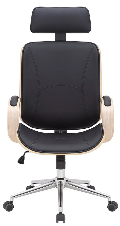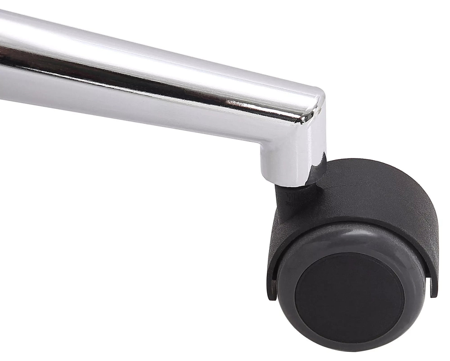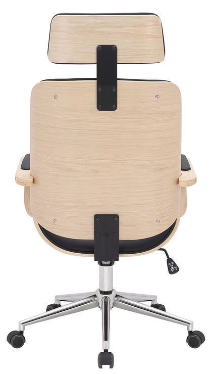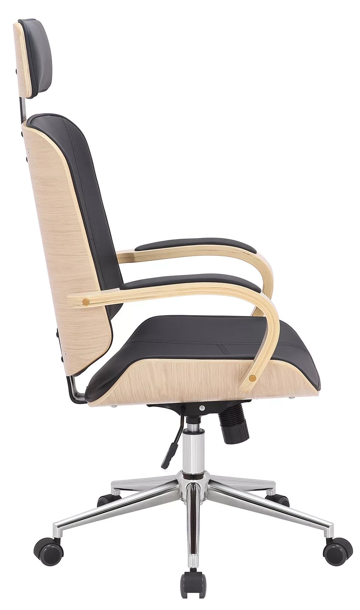 Der Chefsessel Thaddeus ist ein stilvoller Bürostuhl mit einer sehr hochwertigen Polsterung mit Kunstlederpolsterung. Kunstlederbezüge haben den Vorteil, dass sie elastisch sind und sich bei Entlastung wieder aufrichten. Das sieht nicht nur schöner aus, sondern verlängert auch die Lebensdauer des Sitzbezugs. Das geschwungene Holzgestell macht diesen Bürostuhl zum absoluten Hingucker und verleiht ihm ein elegantes Design. Dank der stufenlos verstellbaren Sitzhöhe ist ergonomisches Sitzen gewährleistet und die eingebaute Wippmechanik sorgt für mehr Bewegungsfreiheit. Das Gestell besteht aus Metall in Chromoptik und ist sehr stabil. Der Bürostuhl steht sicher auf fünf leichtgängigen Rollen. Egal ob Hartboden oder Teppich, Sie rollen immer leicht und locker über den Boden.