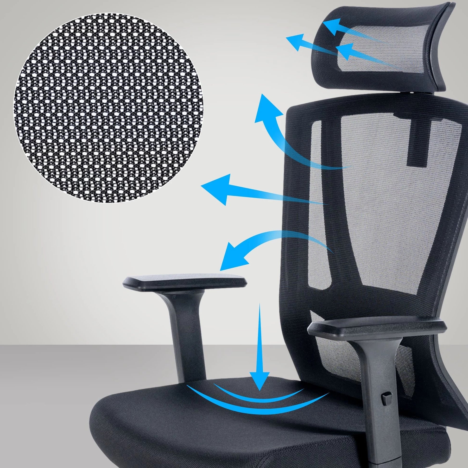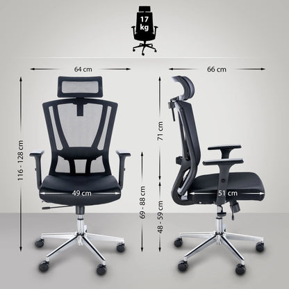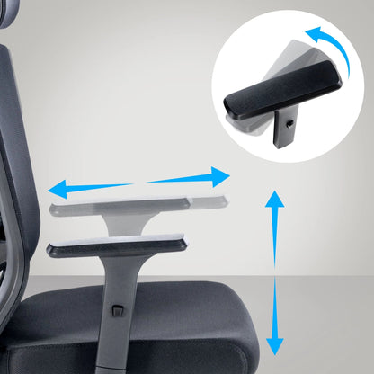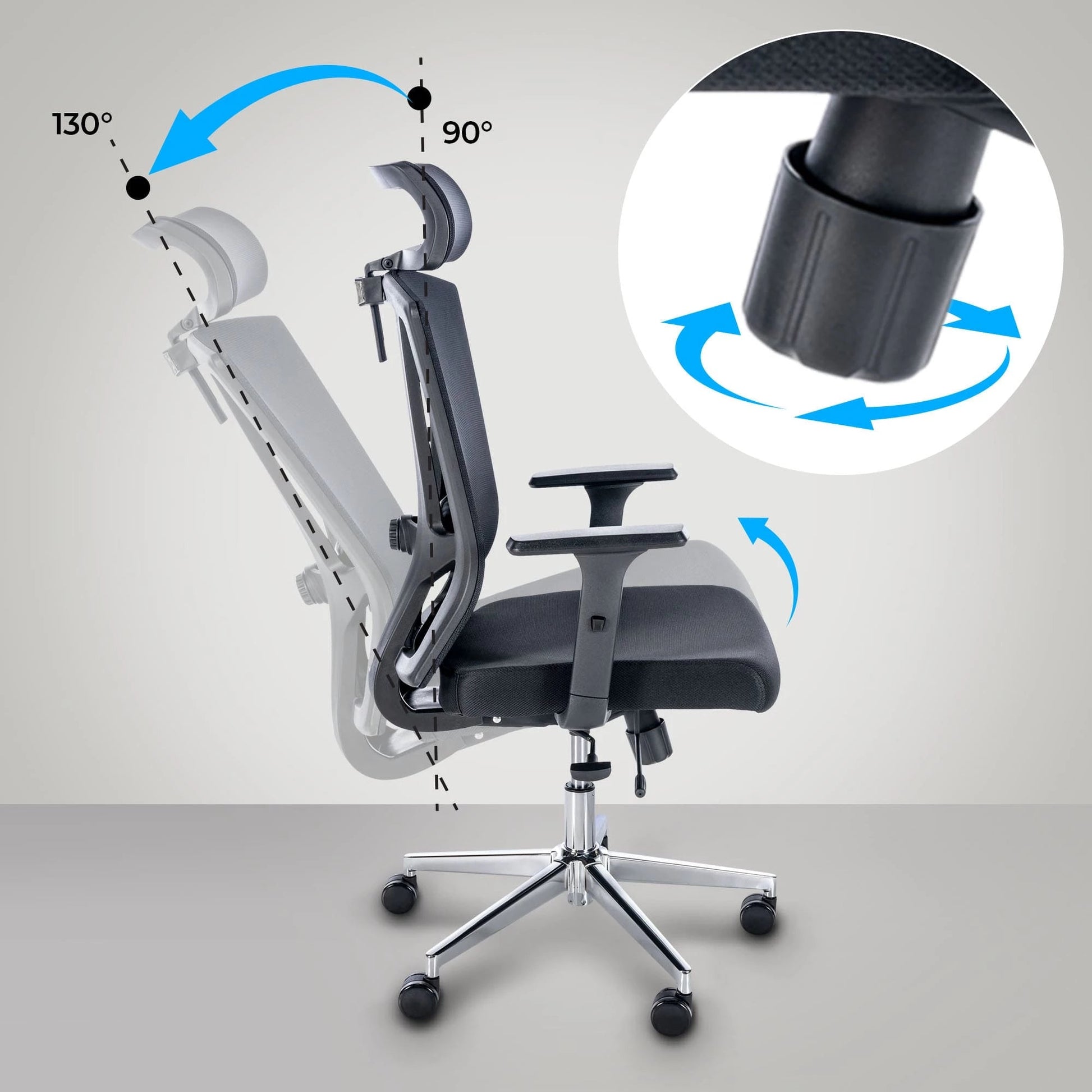 Die ergonomischen Features sind zahlreich: Die Rückenlehne verfügt über eine Neigefunktion mit Synchronmechanik, dreistufige Befestigungsmöglichkeit und Neigungsspannungsverstellung. Der Stuhl kann bis zu 130 Grad geneigt werden. Die Stärke der Lordosenstütze kann durch Verstellen der Tiefe angepasst werden. Die höhenverstellbare Kopfstütze und die 3D-verstellbaren Armlehnen sorgen für eine Entlastung des Nacken- und Schulterbereichs. Die Armlehnen sind in Höhe, Tiefe und Ausrichtung der Auflagefläche verstellbar.