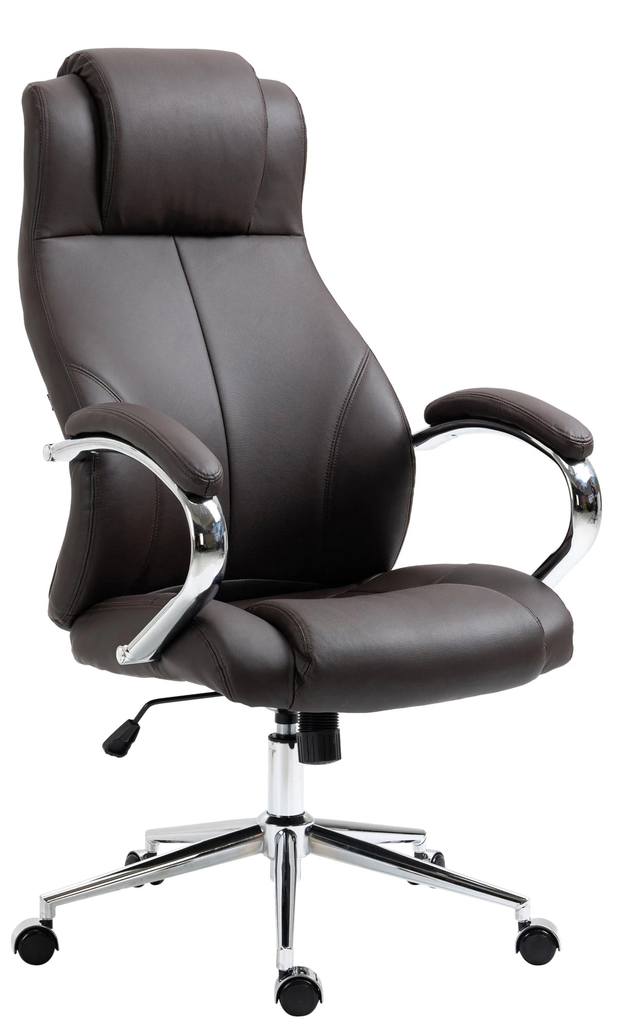 Bei der Polsterung handelt es sich um eine Echtlederpolsterung aus hochwertigem, strapazierfähigem Rindsleder und das Stuhlgestell besteht aus Metall in Chromoptik. Mit fünf beweglichen, leichtgängigen Kunststoffrädern sorgt der Drehstuhl für mühelose Fortbewegung am Arbeitsplatz. Der Bürostuhl lässt sich flexibel in der Sitzhöhe und Spannung der Wippmechanik verstellen.