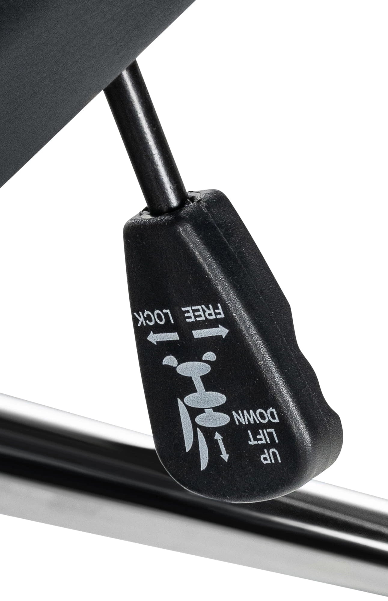 Der Stuhl lässt sich vielfältig verstellen: höhenverstellbar, 360 Grad drehbar und mit einer Kippfunktion ausgestattet, der Sitz lässt sich auch fixieren.