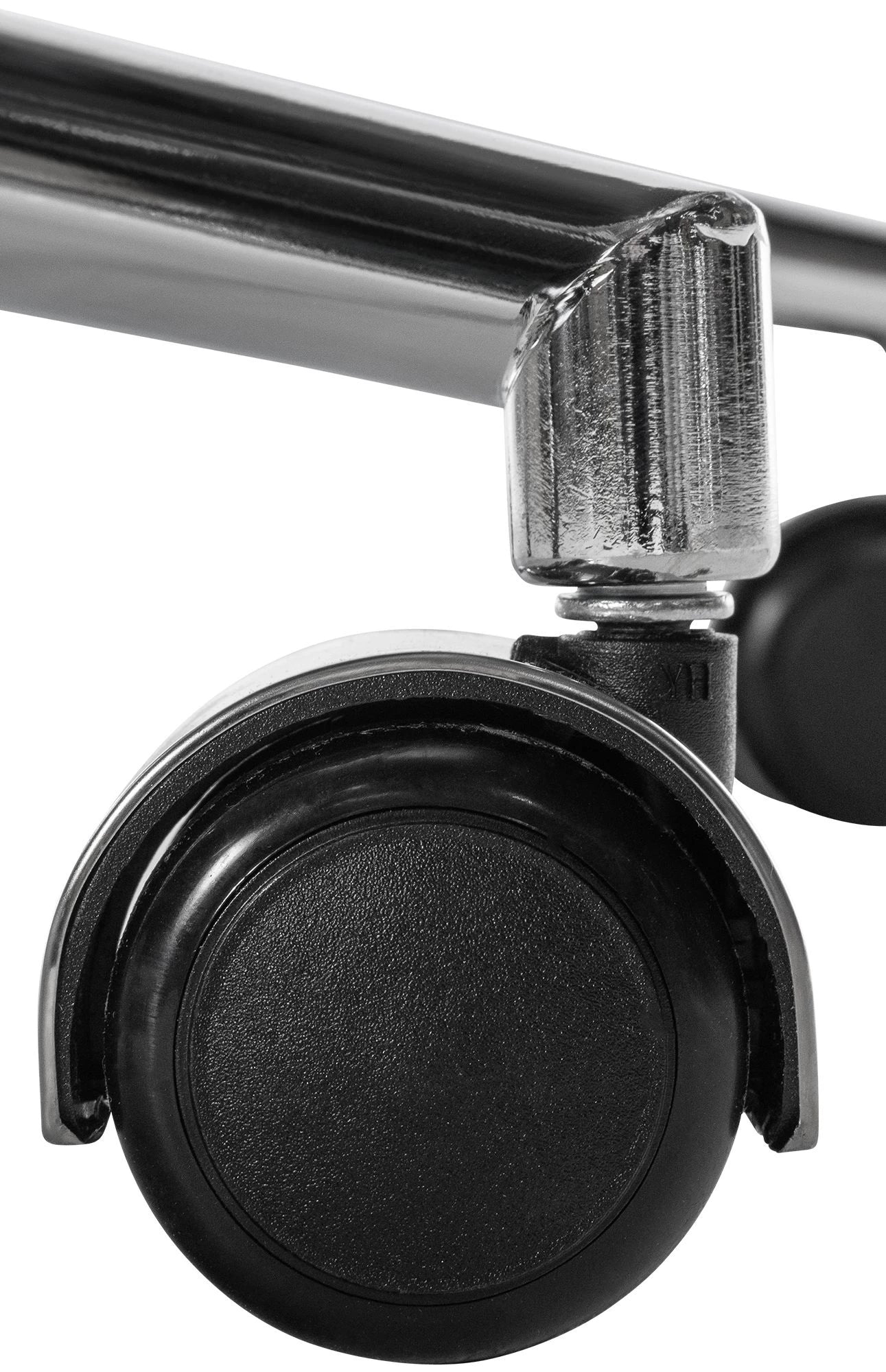 Das robuste Metallgestell in Chromoptik sorgt für Stabilität und Eleganz. Ausgestattet mit Rollen kann dieser Drehstuhl bis zu 135 Kilogramm tragen.