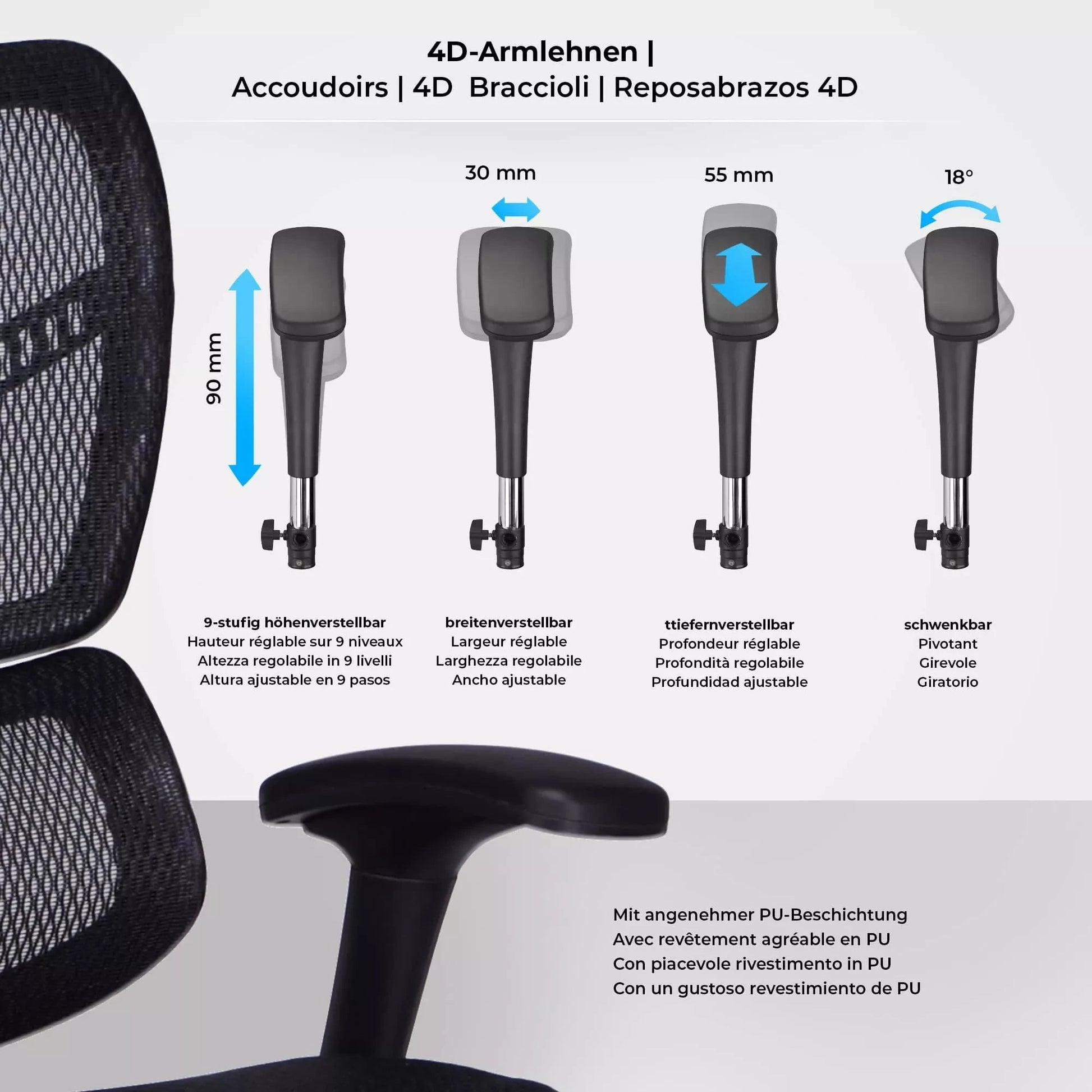 Der üppige Sitz hat eine Rundung, die die Last gleichmäßig auf Oberschenkel und Gesäß verteilt. Schließlich entlasten die 4D-Armlehnen den Schulter- und Nackenbereich. 4D steht in diesem Zusammenhang für vierdimensionale Verstellbarkeit: Neben der Höhen- und Tiefenverstellung lassen sich die Armlehnen drehen und in der Breite verstellen.
