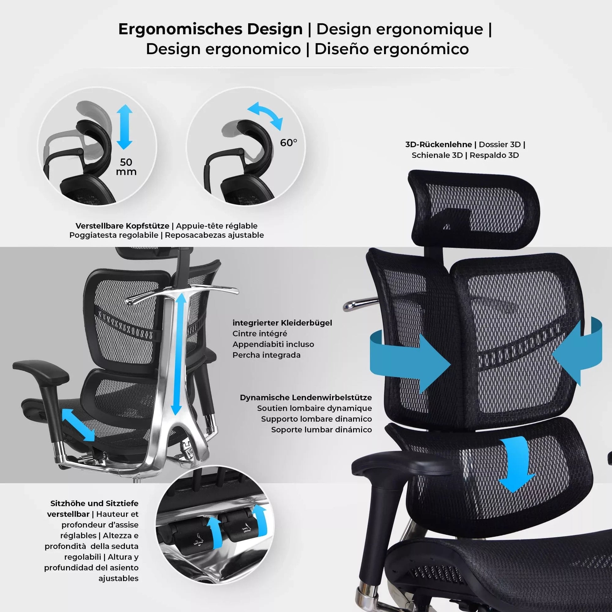 Das Herzstück des Arbeitsstuhls ist die multifunktionale Rückenlehne. Die vierstufig höhenverstellbare Rückenlehne lässt sich genau an Ihre Wünsche anpassen und entlastet die Bandscheiben. Die Rückenlehne lässt sich um bis zu 125 Grad neigen und die Neigungsspannung lässt sich separat einstellen. Der Drehstuhl verfügt über eine Synchronmechanik, die es ermöglicht, dass sich die Sitzfläche mit der Rückenlehne bewegt. Zusätzlich zur Lordosenstütze sorgt die 3D-Funktion der Rückenlehne für noch mehr Ergonomie. Sie können die beiden Hälften des oberen Teils der Rückenlehne nach Wunsch verstellen. Beim Entspannen steht Ihnen die höhen- und neigungsverstellbare Kopfstütze zur Verfügung.