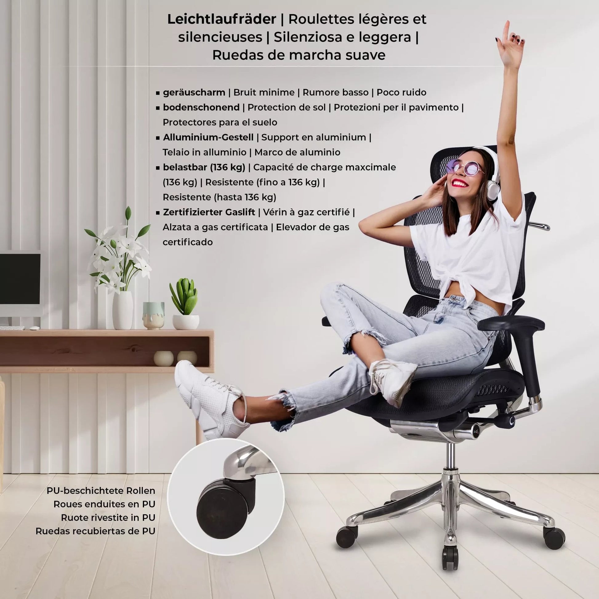 Der Netzbezug ist schick und funktional zugleich. Neben seiner Atmungsaktivität überzeugt der Stoff durch seine hohe Strapazierfähigkeit. Rahmen und Gestell bestehen aus schwarzem Nylon und Aluminium mit moderner Chromoptik. Der Stuhl bewegt sich auf PU-beschichteten Rollen, die empfindliche Böden schonen und leise sind.