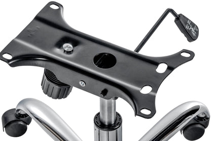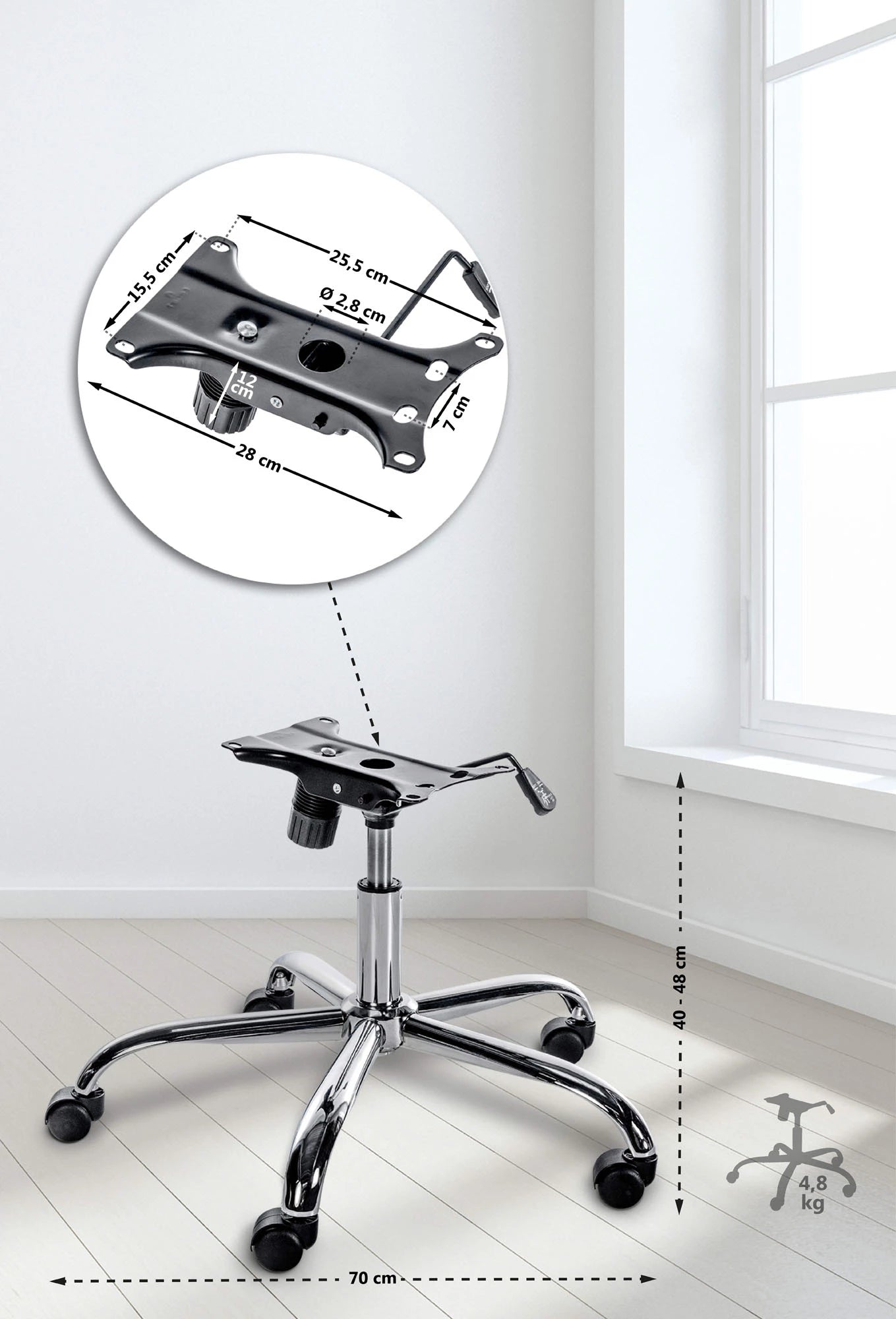 Mit diesem Gestell ermöglichen wir Ihnen, Ihren Bürostuhl zu reparieren oder ihm neuen Glanz zu verleihen. Sollte Ihr Bürostuhlgestell defekt oder zerkratzt sein und Sie daher mit der Bedienung und Optik Ihres Bürostuhls nicht mehr zufrieden sein, müssen Sie Ihren Bürostuhl nicht gleich gegen ein neues austauschen, denn dieses Gestell ist universell montierbar und einsetzbar für Stühle mit den richtigen Abmessungen. Das Gestell verfügt über 5 leichtgängige Rollen, ist höhenverstellbar und verfügt über eine Wippfunktion.