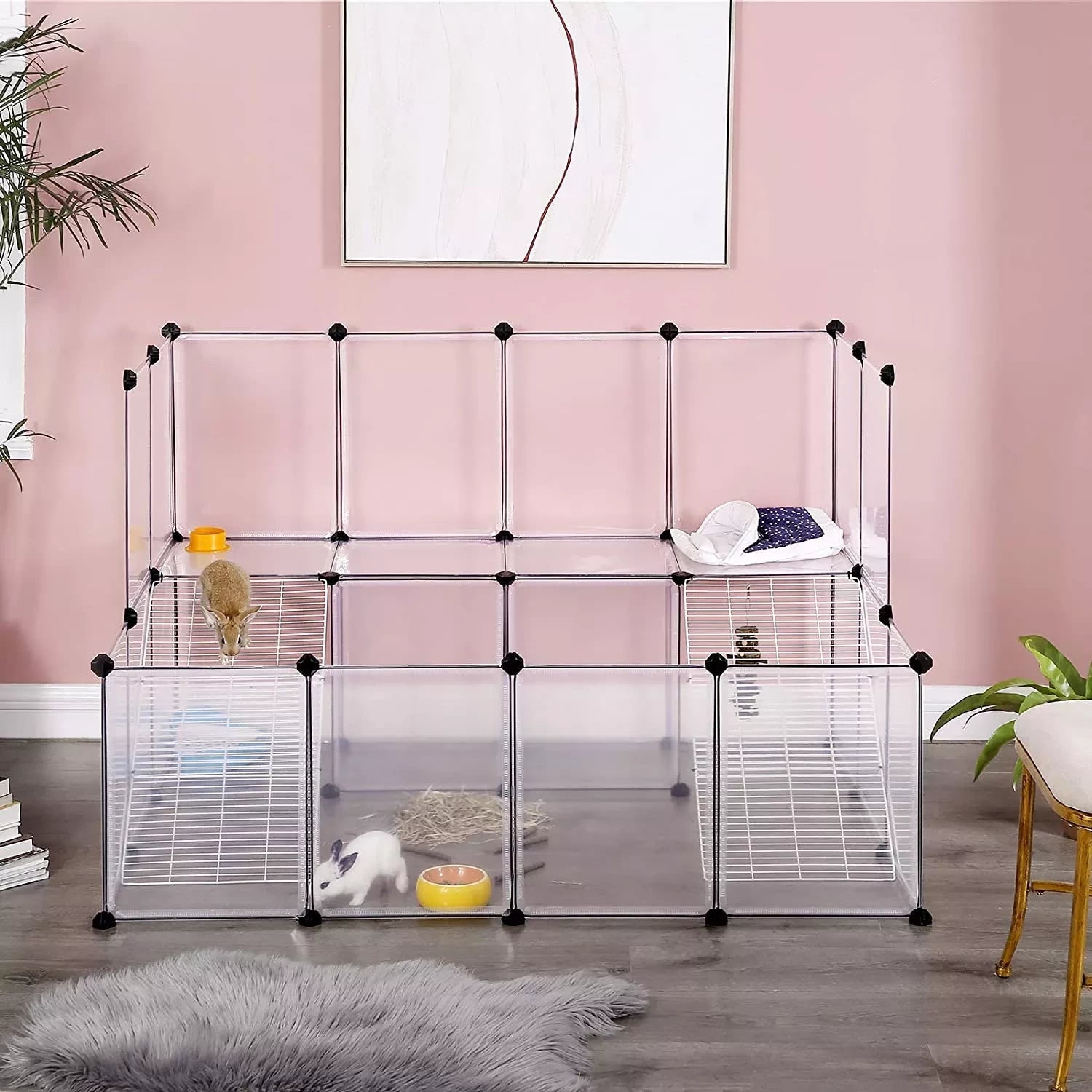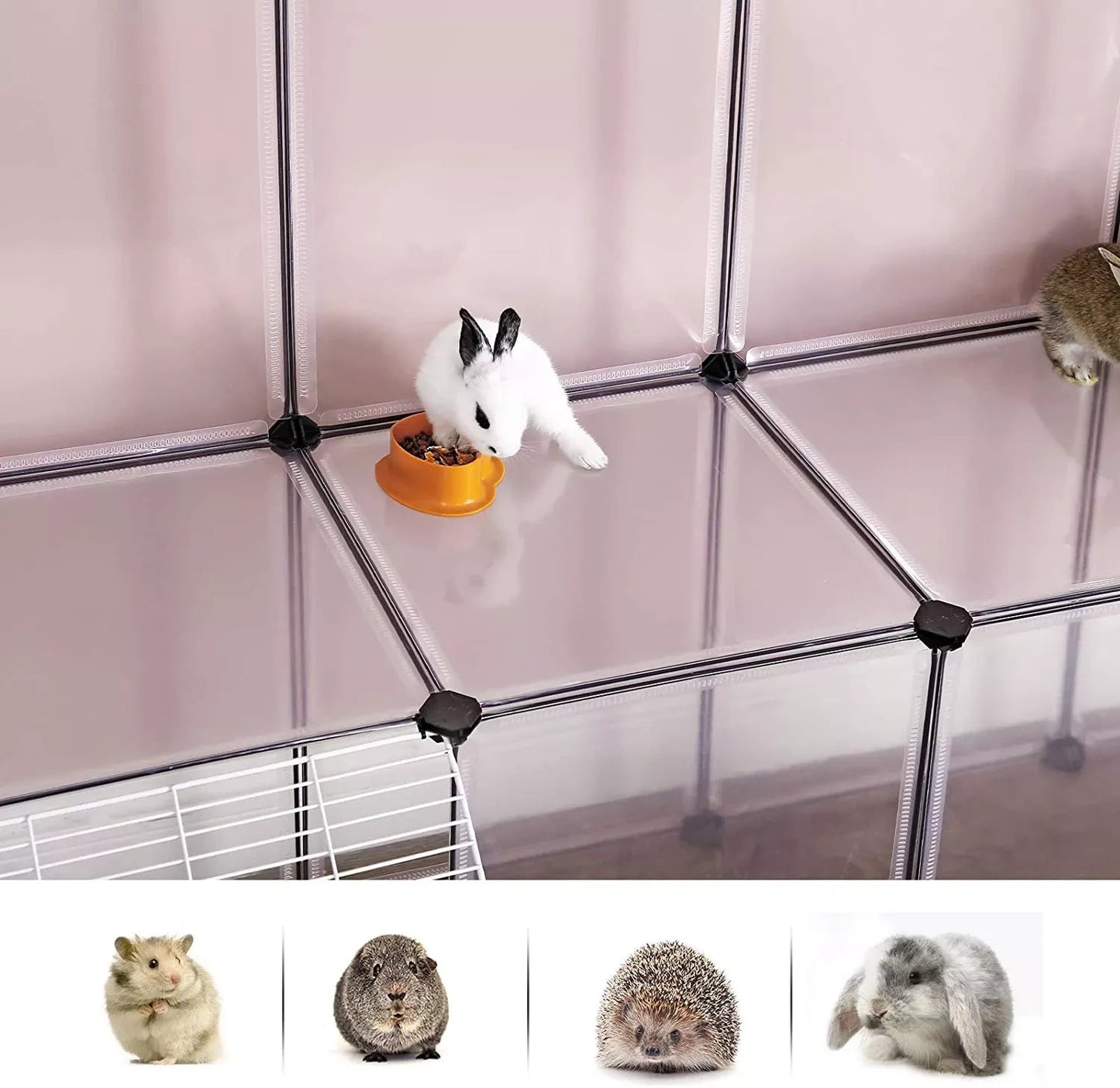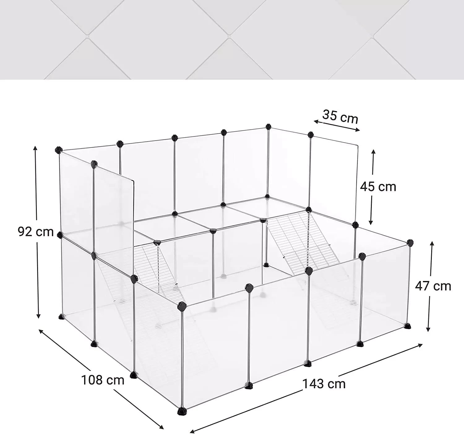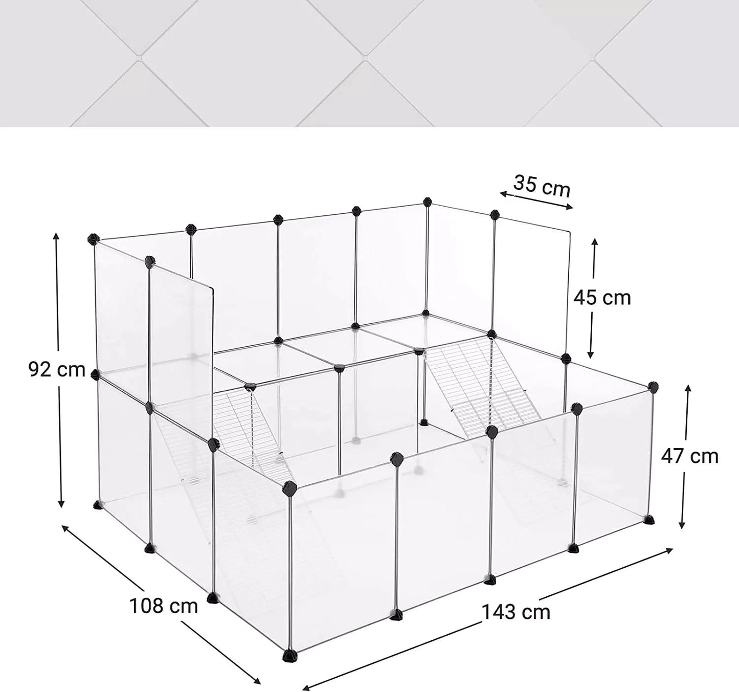 DIY Kleintiergehege: Ganz gleich, ob in Ihrer Wohnung Meerschweinchen, Hamster oder Kaninchen herumspringen, nutzen Sie dieses Gehege, um Ihre Liebe zu Ihren kleinen Freunden zum Ausdruck zu bringen. Das Schloss mit Balkon und Terrasse bietet neugierigen Rackern einen geschützten Bereich, in dem sie frei herumlaufen und Neues entdecken können. Für angenehme Momente: Die transparenten Paneele des Stalls sorgen dafür, dass Ihr Haustier immer das Gefühl hat, dass Sie in Ihrer Nähe sind. Setzen Sie sich am Wochenende auf die Couch und beobachten Sie, wie Ihre Kleinen entspannen, herumtollen oder ihr neues Zuhause erkunden. Was für glückliche Momente! Produktdetails: Farbe: Weiß Material: PP-Kunststoffplatten mit Metallrahmen, Verbindungsstücke aus ABS-Kunststoff Abmessungen: 143 x 108 x 92 cm (L x B x H) Gewicht: 8,1 kg max. Statische Belastbarkeit: 10 kg Lieferumfang: 24 x Kunststoffplatte (45 x 35 cm)4 x Kunststoffplatte (35 x 35 cm)4 x Metallgitter (45 x 35 cm)44 x Kunststoffverbindungsstück100 x Kabelbinder20 x Anti -Rutschunterlage1 x Hammer1 x Anleitung (DE, EN, FR, IT, ES) In- und Out-Match Hinweise: Dieses Gehege ist nur für Kleintiere geeignet. Bitte nicht für Hunde und Katzen verwenden. Achten Sie bei der Montage darauf, dass die Kunststoffplatten vollständig in die Kunststoffanschlüsse einrasten, um die Stabilität des Gehäuses zu erhöhen. Verbinden Sie außerdem zwei nebeneinander platzierte Kunststoffplatten mit Kabelbindern. Setzen Sie sich hin, fallen Sie nicht auf dieses Produkt und halten Sie es von Feuer und Wärmequellen fern. Stellen Sie dieses Produkt nicht für längere Zeit im Freien auf.