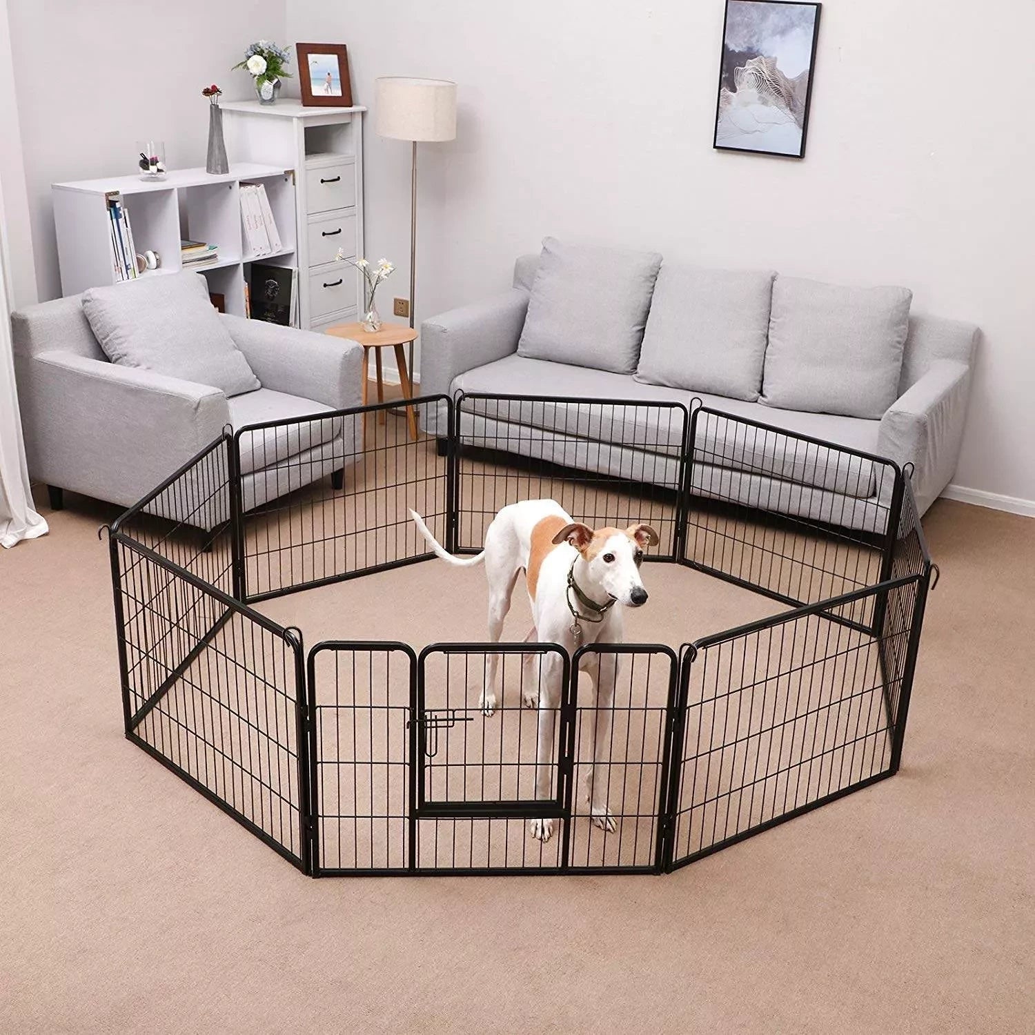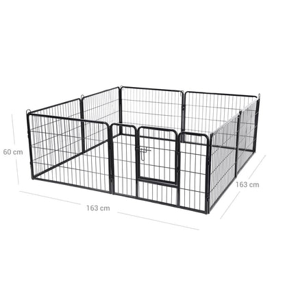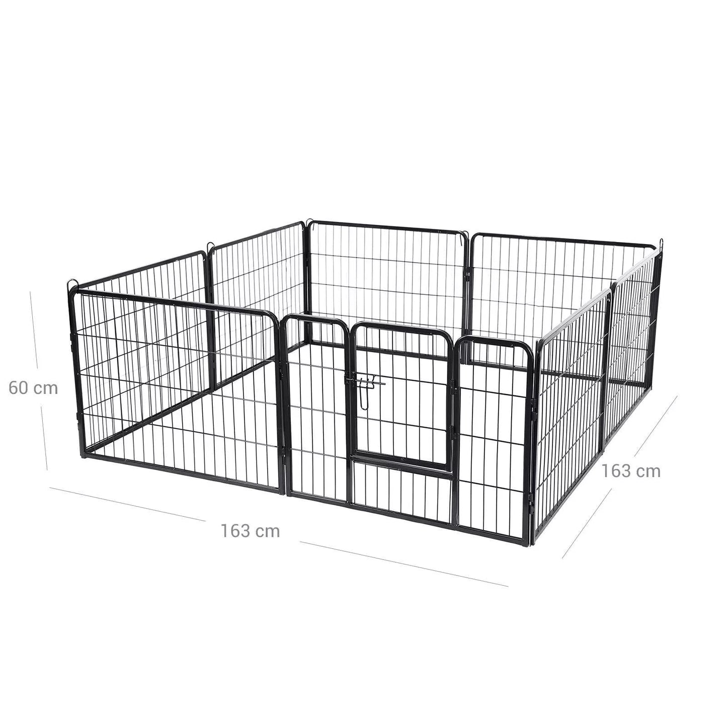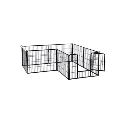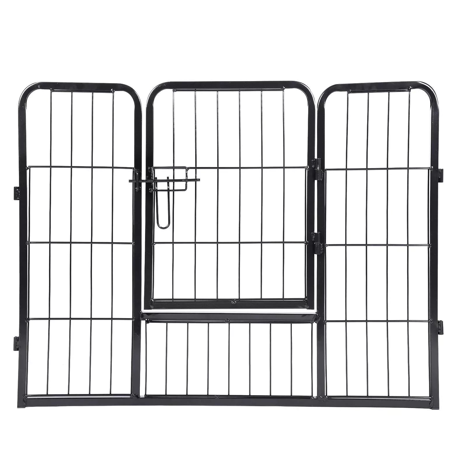 SICHERHEIT: Abgerundete Ecken und Kanten verhindern Verletzungen Ihres Haustiers und Ihrer selbst. PERFEKTES DESIGN: Ausgestattet mit zwei L-förmigen Türriegeln ist dieser Käfig sicher und die Tür kann nicht durch starkes Schütteln geöffnet werden. Ein Ende jeder Eisenstange ist mit Kunststoff beschichtet, um Rost, Schäden am Boden und übermäßige Geräusche beim Bewegen zu verhindern. EINFACHE STRUKTUR: Das Design ermöglicht eine einfache Demontage zur Aufbewahrung, wenn die Box nicht verwendet wird, und die Zaunschienen sind modular, sodass Sie sie in verschiedenen Formen (rechteckig, quadratisch oder achteckig) zusammenbauen können. VIELFÄLTIGE VERWENDUNG: Sie können es zu Hause und im Freien für Ihre Hunde, Kaninchen und andere Kleintiere verwenden.