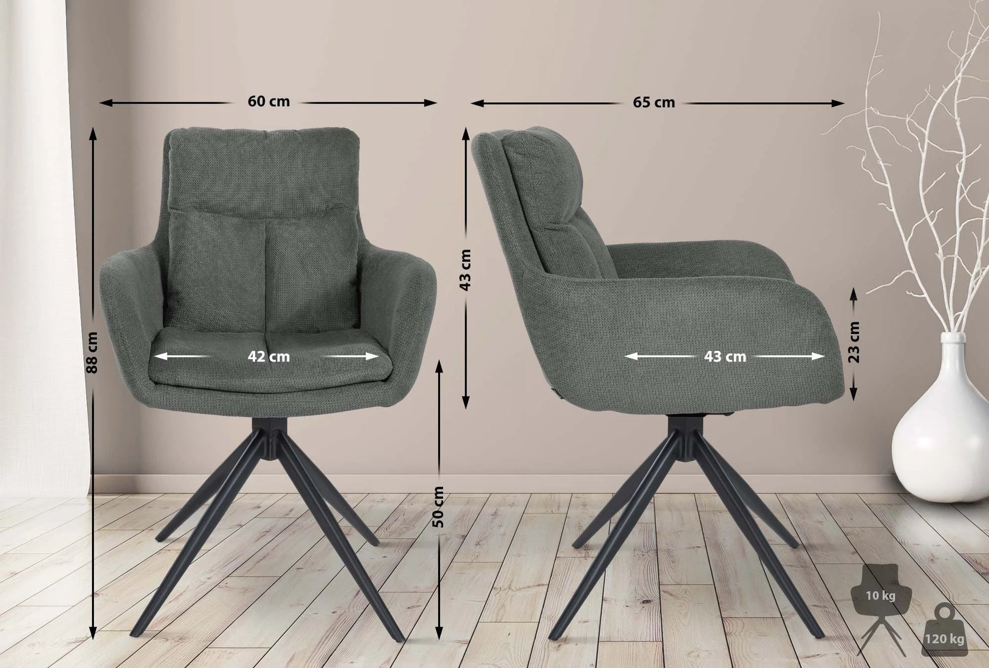 Der Schlüssel zu einem bequemen Sitz ist die angenehme Polsterung von Sitzfläche, Rückenlehne und Armlehnen. Die Sitzschale ist mit einem pflegeleichten und robusten Stoffbezug bezogen. Die sogenannte Drehfunktion sorgt dafür, dass der Stuhl über einen Bereich von 180 Grad gedreht werden kann, was für zusätzliche Bewegungsfreiheit sorgt.