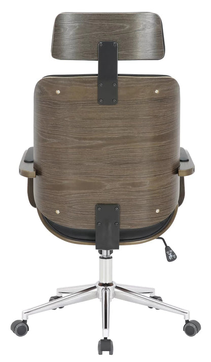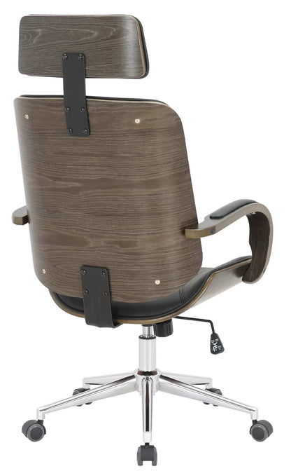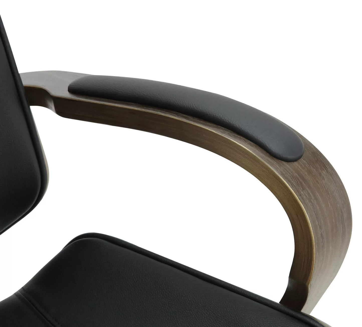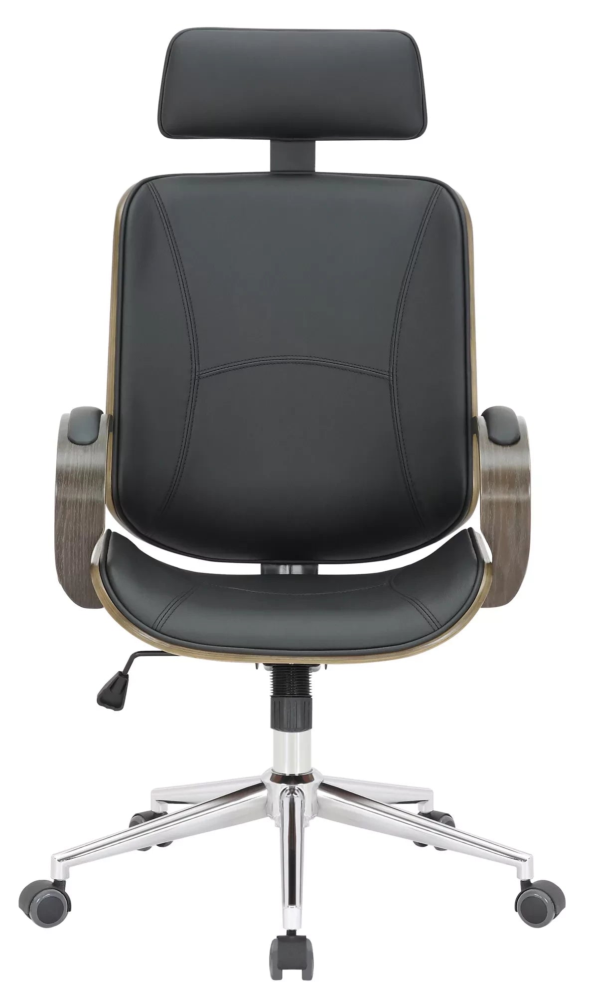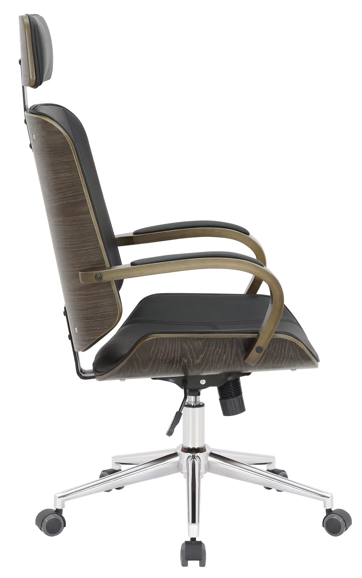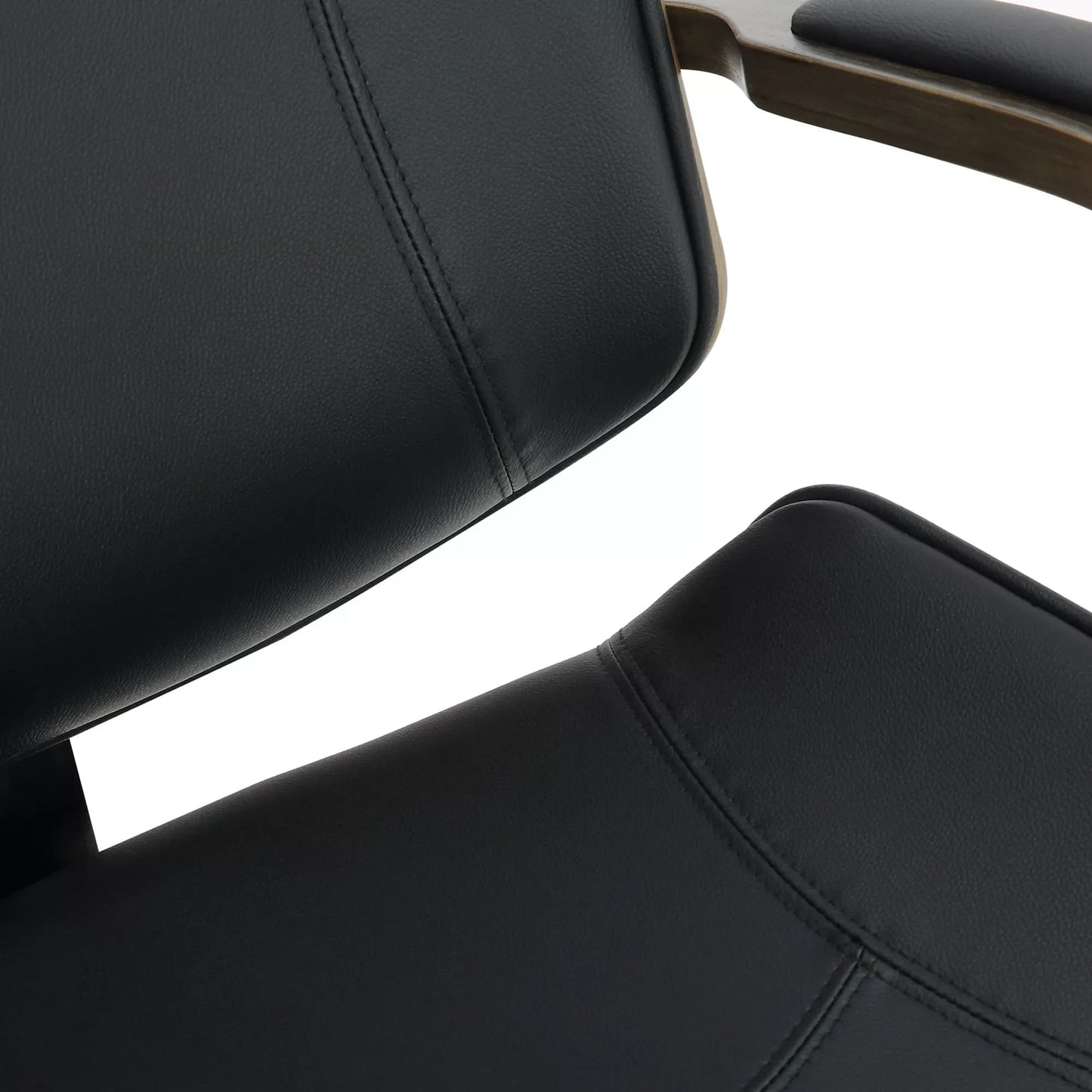 Der Chefsessel ist ein stilvoller Bürostuhl mit einer sehr hochwertigen Polsterung mit Kunstlederpolsterung. Kunstlederbezüge haben den Vorteil, dass sie elastisch sind und sich bei Entlastung wieder aufrichten. Das sieht nicht nur schöner aus, sondern verlängert auch die Lebensdauer des Sitzbezugs. Das geschwungene Holzgestell macht diesen Bürostuhl zum absoluten Hingucker und verleiht ihm ein elegantes Design. Dank der stufenlos verstellbaren Sitzhöhe ist ergonomisches Sitzen gewährleistet und die eingebaute Wippmechanik sorgt für mehr Bewegungsfreiheit. Das Gestell besteht aus Metall in Chromoptik und ist sehr stabil. Der Bürostuhl steht sicher auf fünf leichtgängigen Rollen. Egal ob Hartboden oder Teppich, Sie rollen immer leicht und locker über den Boden.