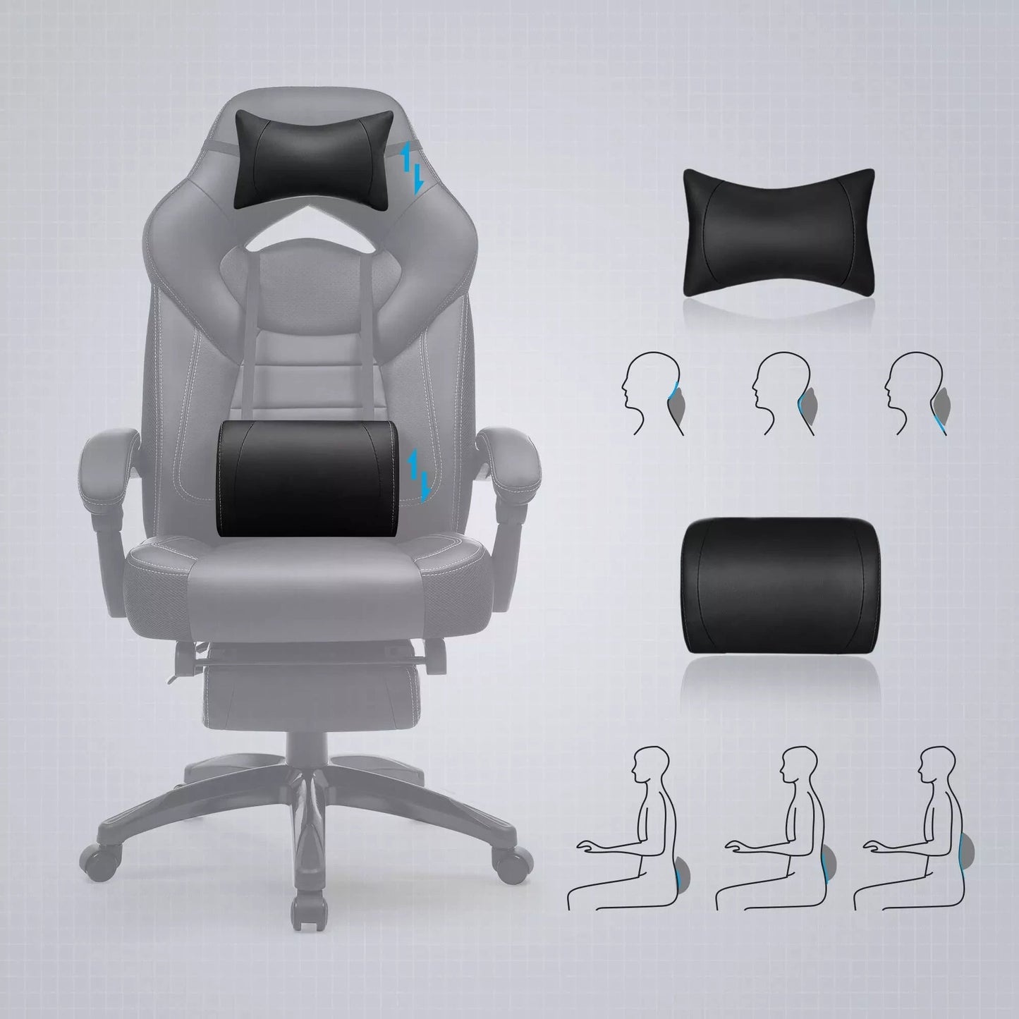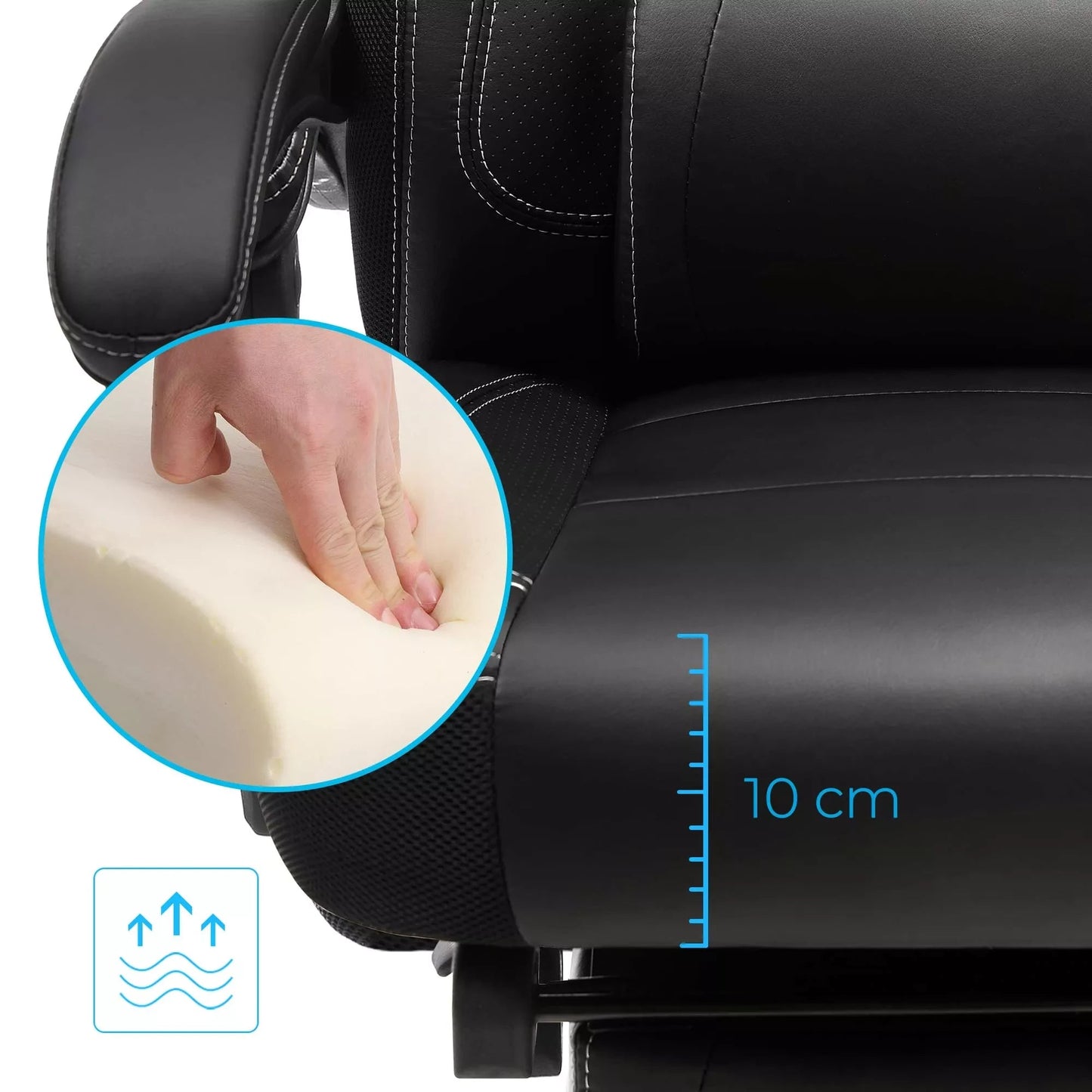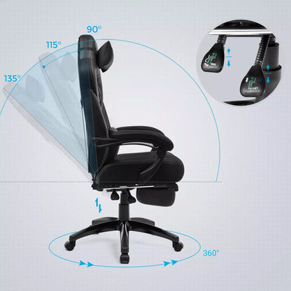 Das Beste für die Besten: Wer in der virtuellen Welt der Beste sein will, braucht in der realen Welt die richtige Ausrüstung. Zu einem idealen Gaming-Setup gehört nicht nur eine leistungsstarke CPU oder Grafikkarte, sondern auch das richtige Zubehör wie Maus, Tastatur und ja, ein Gaming-Stuhl. - Bereitstellung von Erfahrung mit Kosten auf Indie-Ebene. Überlegener Komfort: Dieser Bürostuhl bietet ein Gesamtpaket bestehend aus einem Lendenkissen, einer S-förmigen Rückenlehne und einer verstellbaren und abnehmbaren Kopfstütze. All diese Elemente zusammen sorgen für perfekten Sitzkomfort auf diesem Gaming-Stuhl, der einer Belastung von bis zu 150 kg standhält, während Ihr Adrenalinspiegel beim Gaming steigt. Zurücklehnen: Wenn Sie nicht spielen, sondern sich einfach zurücklehnen und einen Film schauen möchten, können Sie die Rückenlehne zwischen 90 und 135 verstellen und die Fußstütze verlängern. Entspannen Sie sich in der bequemsten Position! Produktdetails: Farbe: Schwarz Material: Kunstleder, Schaumstoff, Nylon Abmessungen: 70 x 64 x (120-128) cm (L x B x H) Gewicht: 20,5 kg Max. Statische Belastbarkeit: 150 kg. Lieferumfang: 1 x Bürostuhl, 1 x Ersatzrolle, 1 x Zubehörtasche, 1 x Bedienungsanleitung. Inand Outdoormatch. Hinweise: Vermeiden Sie es, das Produkt über einen längeren Zeitraum intensiver Sonneneinstrahlung auszusetzen. Halten Sie das Produkt von scharfen und spitzen Gegenständen fern.