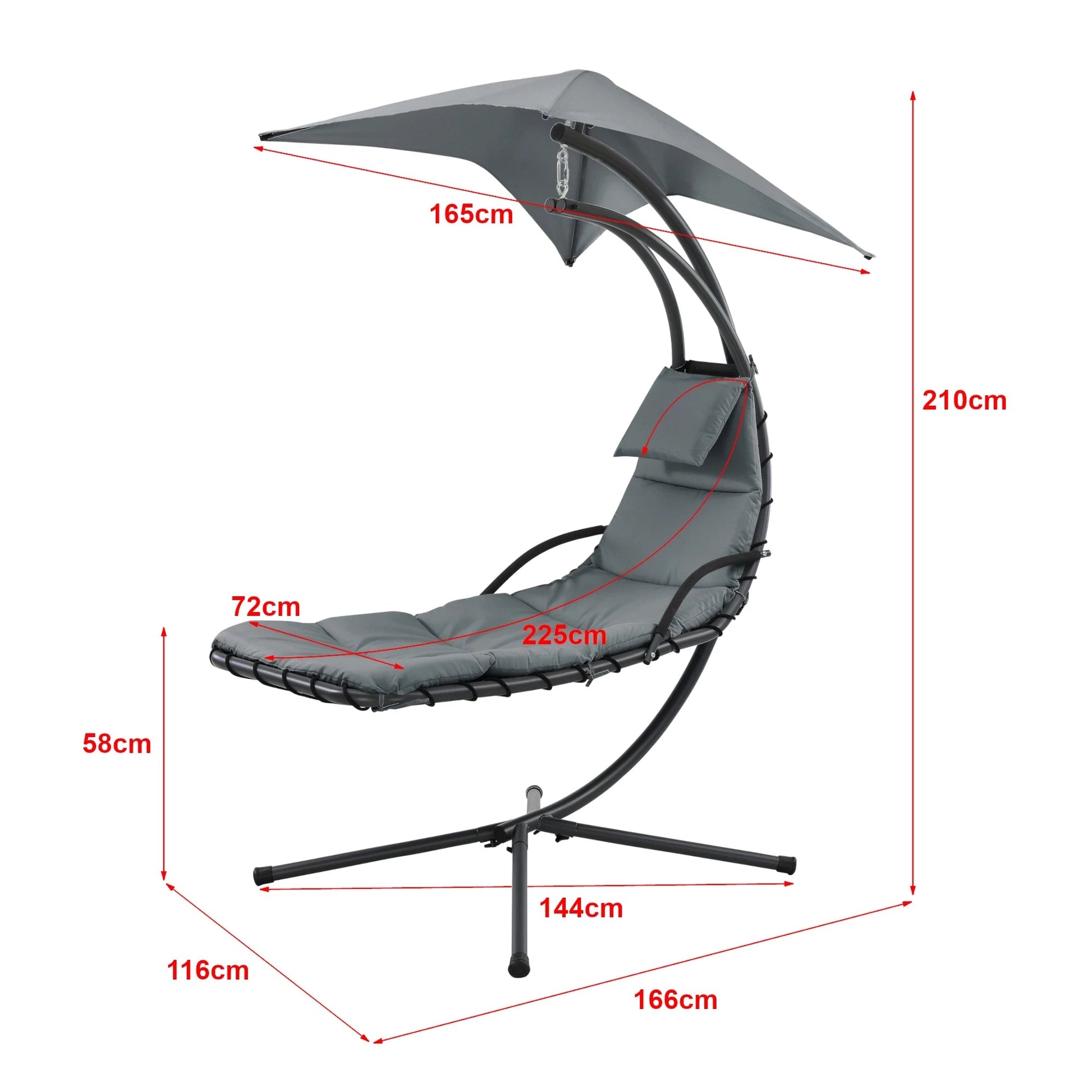 Mit dieser frei schwebenden Hängeliege vereinen Sie die Vorteile einer Liege und denen einer Hängematte. Die gemütliche Polsterung mit Kissen sorgt für hohen Tragekomfort. Das abnehmbare Sonnendach bietet UV-Schutz und Schatten.