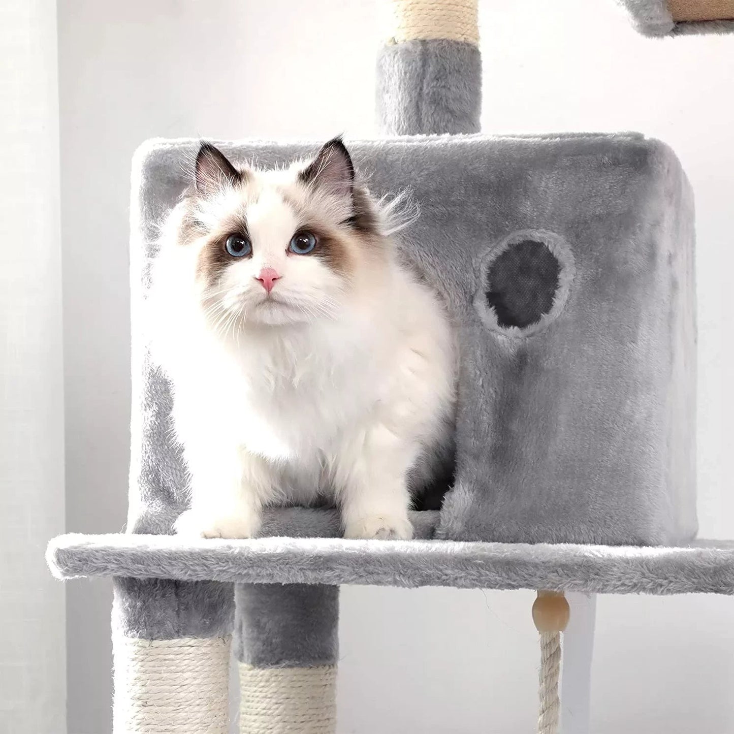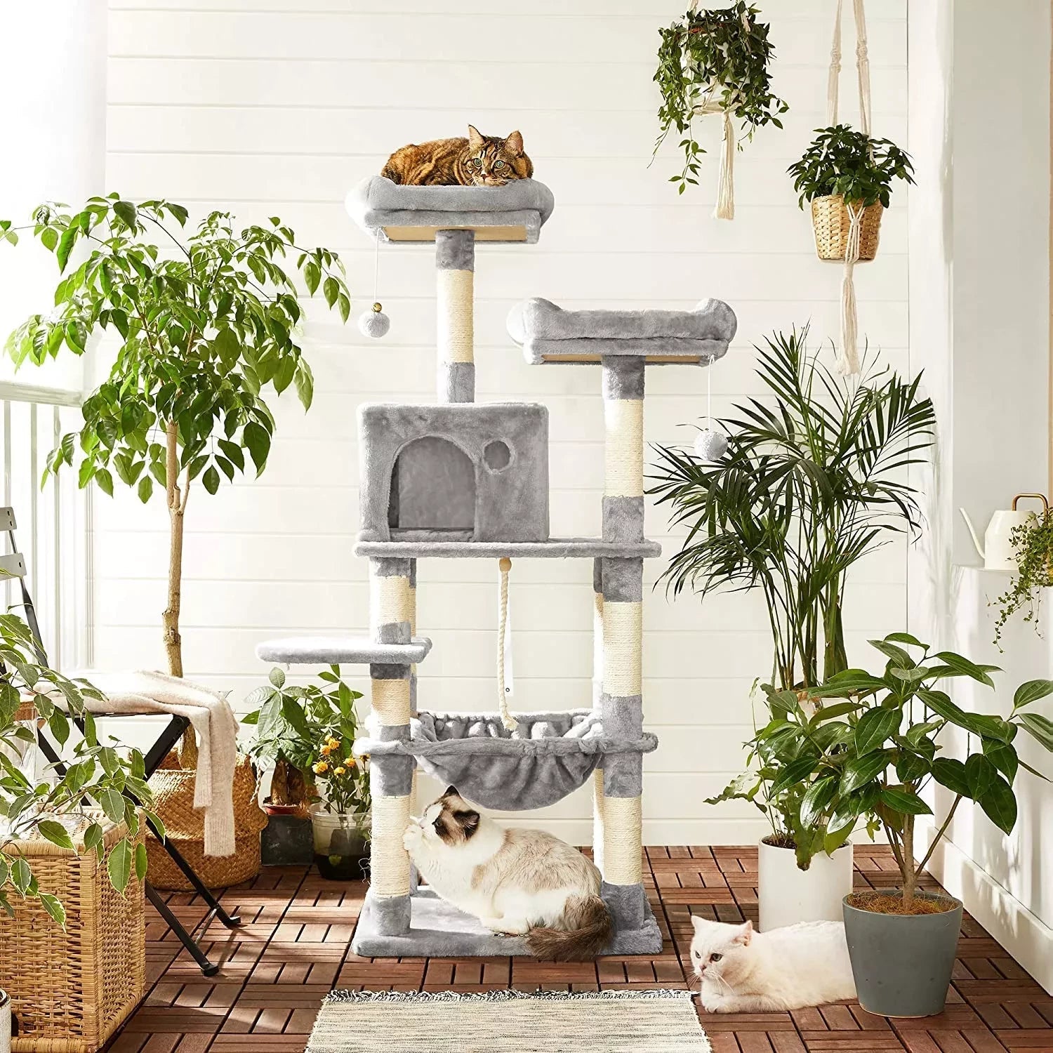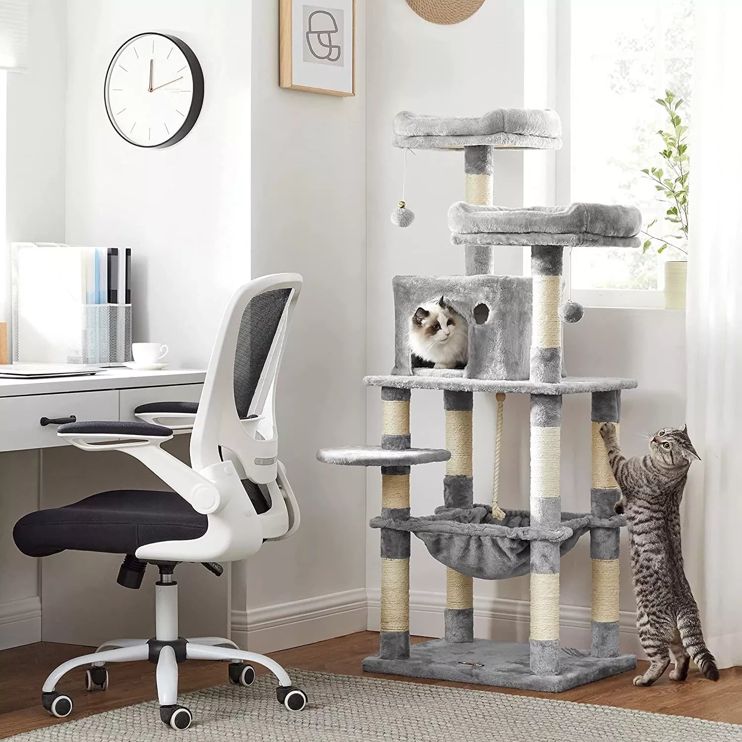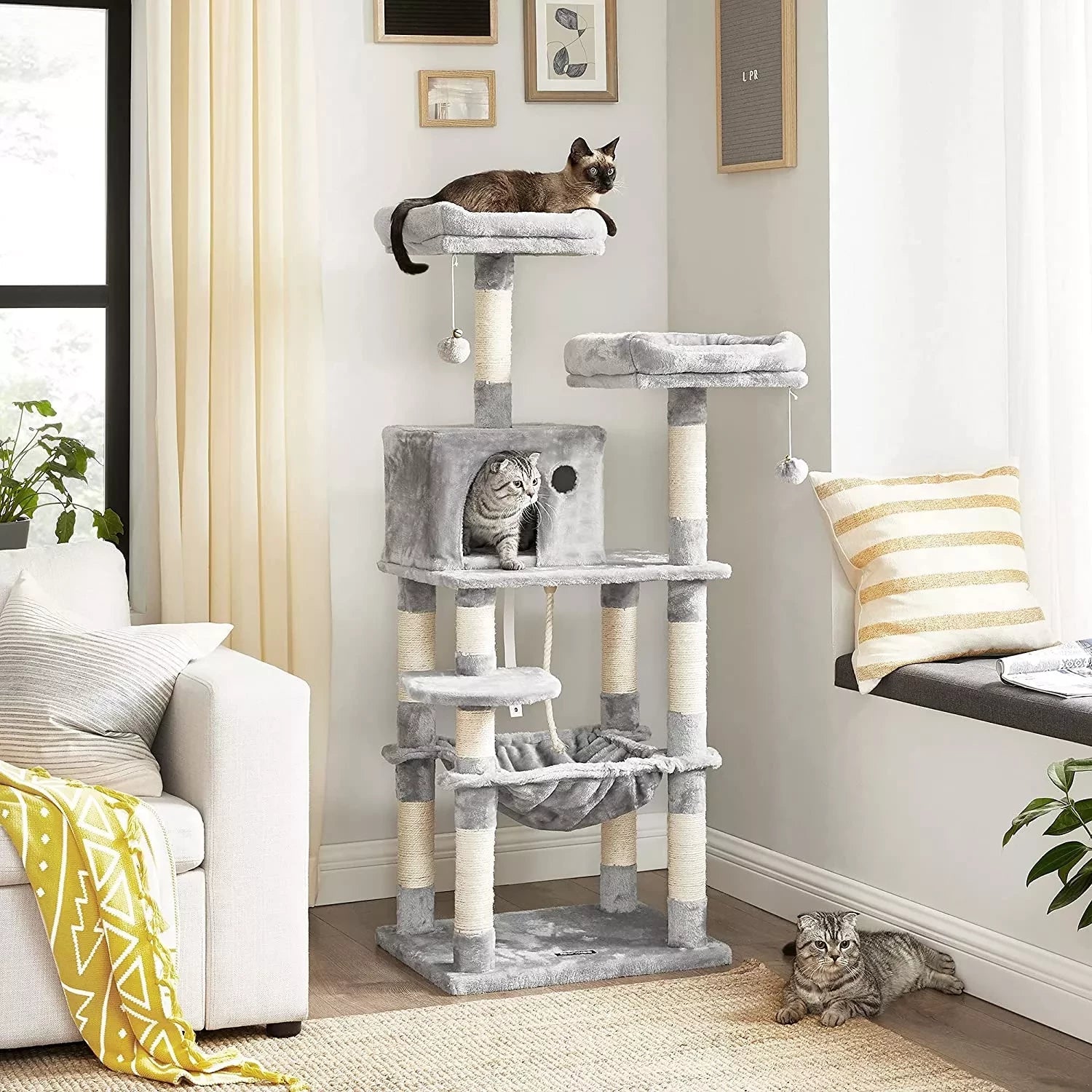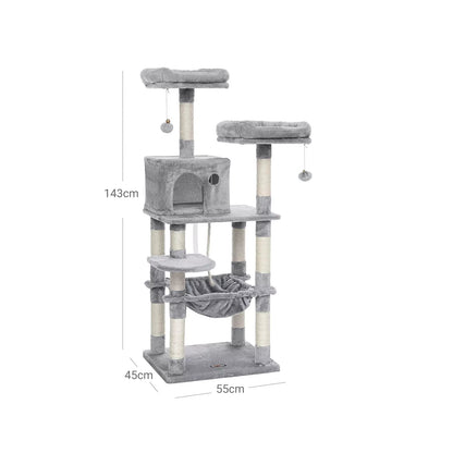 In den Kreativ-Workshops springen zwei süße Kätzchen herum, begutachten alle Kratzbäume persönlich und geben ihr tierisches Feedback. So erfahren die Designer aus erster Hand, ob die Produkte den Ansprüchen verwöhnter Backenbartträger gerecht werden. Die Highlights des Kratzbaums auf einen Blick: - Hohe Stabilität; verfügt über eine holzverstärkte Bodenplatte – Robuste Sisalstämme – Bezogen mit flauschigem, extra strapazierfähigem Plüsch – Gemütliches Katzenhaus – 2 gepolsterte Aussichtsplattformen in unterschiedlichen Höhen – Geräumige, stabile Hängematte – Mittelgroß; geeignet für eine oder zwei Katzen – Intelligentes Stufendesign; leichterer Zugang Produktdetails: - Farbe: hellgrau - Material: MDF (mitteldichte Faserplatte), Plüsch, Sisal - Maße: 55 x 45 x 143 cm (L x B x H) - Gewicht: 14,3 kg Lieferumfang: - 1 x Kratzbaum - 1 x Bedienungsanleitung (DE, EN, FR, ES, IT): - Sollte der Kratzbaum beschädigt sein, wenden Sie sich bitte umgehend an unseren Kundenservice, um Ersatzteile zu erhalten oder eine andere zufriedenstellende Lösung zu finden. Bitte beachten Sie, dass ein beschädigtes Produkt dazu führen kann, dass sich Ihre Katzen verletzen. - Wenn Ihre Katzen auf dem Haarball oder dem Gummiband kauen, entfernen Sie das Spielzeug sofort und bewahren Sie es an einem Ort auf, an dem Ihre Katze es nicht erreichen kann.