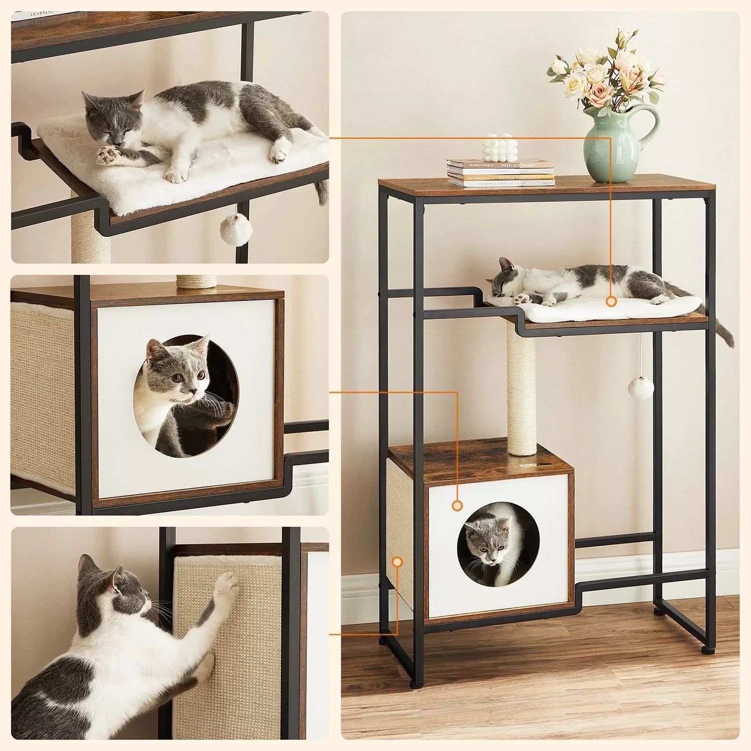 In den Kreativ-Workshops springen zwei süße Kätzchen herum, begutachten alle Kratzbäume persönlich und geben ihr tierisches Feedback. So erfahren die Designer aus erster Hand, ob die Produkte den Ansprüchen verwöhnter Backenbartträger gerecht werden. Die Highlights dieses 2-in-1-Katzenmöbels auf einen Blick: - Eine große obere Ablage zur Aufbewahrung Ihrer Habseligkeiten. - Zwei weiche Kissen. - Eine Plattform und eine Kuschelhöhle zum Entspannen und Verstecken. - Sisalstangen und eine Sisalmatte an der Seite, damit die Katzen ihre Krallen schärfen können. - Für die Montage sind lediglich Schrauben erforderlich. -Jede Schraube wird mit einer Ersatzschraube geliefert. - Der Stahlrahmen und die verstellbaren Beine sorgen für Stabilität. Produktdetails: – Farbe: Vintage-Braun – Material: Spanplatte, Stahl, Plüsch, Sisal – Gesamtmaße: 74 x 34 x 114 cm (L x B x H) – Höhlengröße: 46 x 34 x 36 cm (L x B x H) ) - Maße der Sisalmatte: 31 x 30 cm (L x B) - Gewicht: 12,8 kg Lieferumfang: - 1 x Kratzbaum - 1 x Zubehörpaket - 1 x Kippschutzbox - 1 x Bedienungsanleitung Hinweise : - Wenn Ihre Katzen das Kissen kauen, entfernen Sie es sofort. - Wenn das Katzenhaus beschädigt ist, reparieren oder ersetzen Sie es bitte rechtzeitig, um Verletzungen durch beschädigte Teile zu vermeiden. - Bitte befestigen Sie dieses Produkt mit dem angebrachten Kippschutz an der Wand, um eine sichere Verwendung zu gewährleisten.