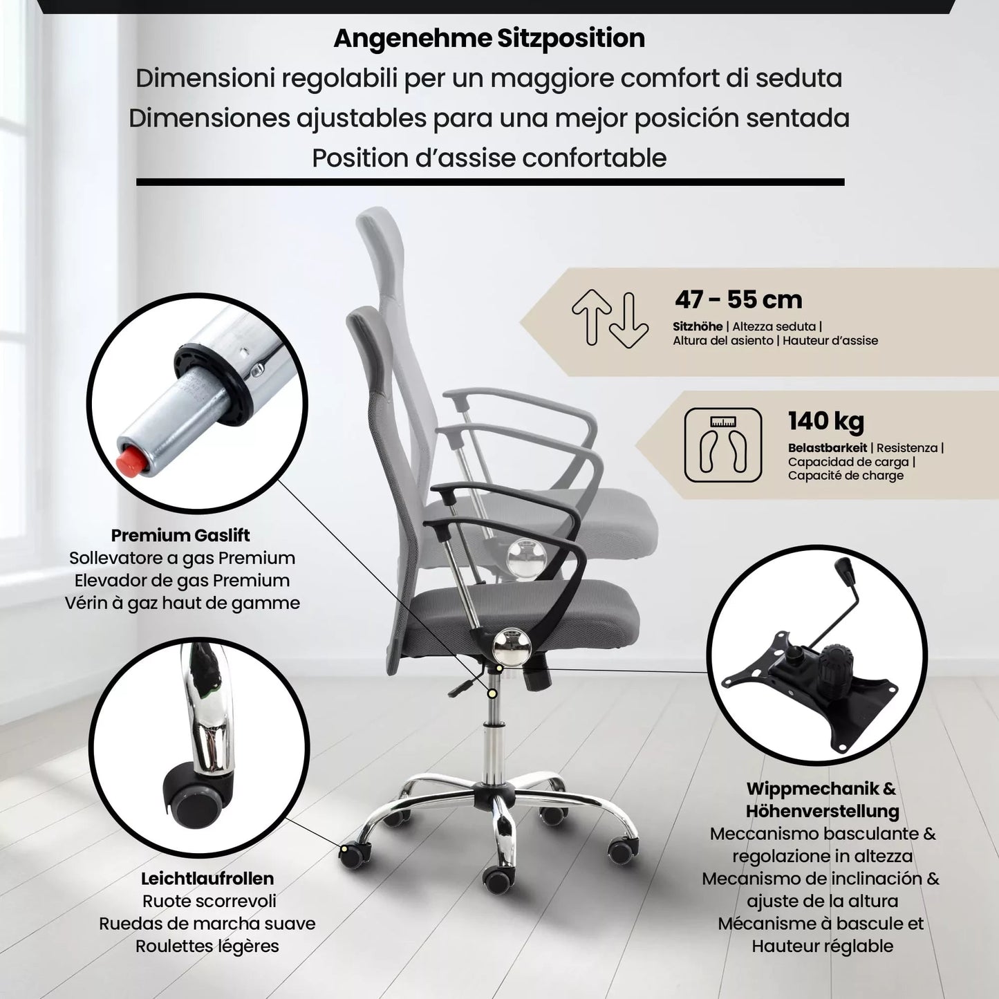 Der Bürostuhl Davin ist höhenverstellbar und bequem mit einer Gasfeder. Die Armlehnen entlasten Ihre Schultern und Ihren Nacken und die ergonomische Rückenlehne stützt Ihren Rücken und Ihre Lendenwirbelsäule.