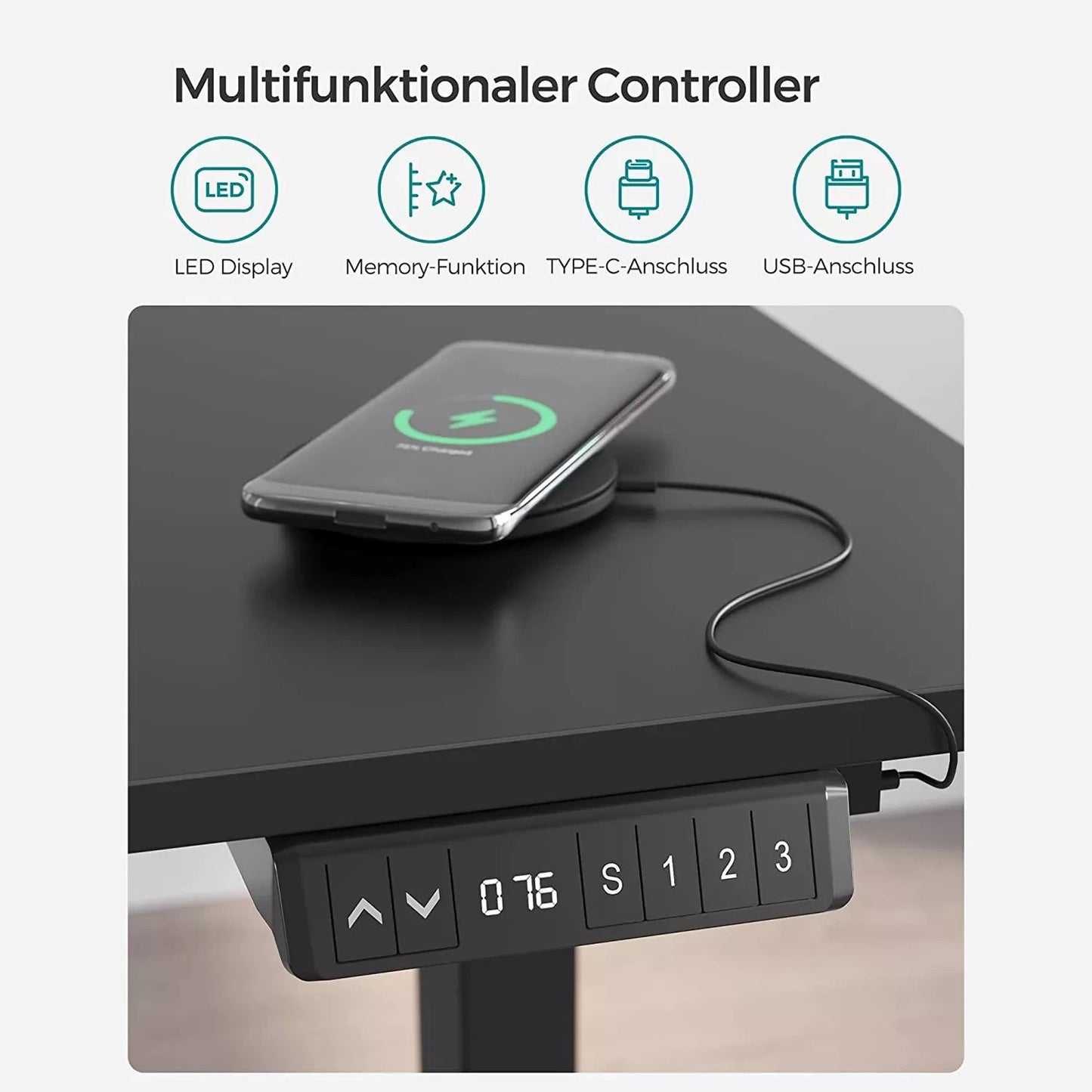 Vorteile des elektrischen Schreibtisches: - Höhenverstellbar von 73,5 bis 119 cm für wechselnde Positionen - Hohe Verstellgeschwindigkeit 25 mm/s bei geringem Geräuschpegel < 50 dB - Qualitätsmotor für sanfte Verstellung Produktdetails: - Farbe: Schwarz - Material: Spanplatte, Stahl – Maße: 60 x 120 x (73,5–119) cm (T x B x H) – Höhenverstellung: 71,5–117 cm – Lautstärke: < 50 dB – Verstellgeschwindigkeit: 25 mm/s – max. statische Belastbarkeit: 80 kg - Gewicht: 29,5 kg Lieferumfang: - 1 x Elektrotisch - 1 x Adapter - 1 x Controller - 2 x Haken - 4 x Räder - 1 x Zubehörpaket - 1 x Anleitung Inand Outdoormatch Hinweise: - Das Produkt wird in 2 Paketen geliefert. Bitte haben Sie etwas Geduld, wenn Sie zunächst nur ein Paket erhalten. Der zweite wird in Kürze geliefert. - Stellen Sie sicher, dass das Tischgestell beim Heben und Senken nicht behindert wird. Stellen Sie den Tisch nicht direkt an eine Wand, um Kratzer an der Wand zu vermeiden. - Das Produkt ist nur für den Innenbereich bestimmt. Halten Sie alle elektrischen Komponenten von Flüssigkeiten fern. - Wenn der Tisch 2 Minuten lang angehoben oder abgesenkt wird, wird der Überhitzungsschutz automatisch aktiviert und Sie müssen 18 Minuten warten, bevor Sie die Höhenverstellung wieder verwenden können. - Der Kollisionsschutz schützt Haustiere und Kinder Stöße und Kratzer. Passen Sie bei Bedarf die Empfindlichkeitsstufe gemäß der Bedienungsanleitung an. - Stellen Sie keine schweren Gegenstände, die die maximale Tragfähigkeit von 80 kg überschreiten, auf das Produkt. - Stellen Sie sicher, dass der Controller waagerecht steht, bevor Sie die Höheneinstellung testen. Halten Sie es nicht zum Testen in der Hand.