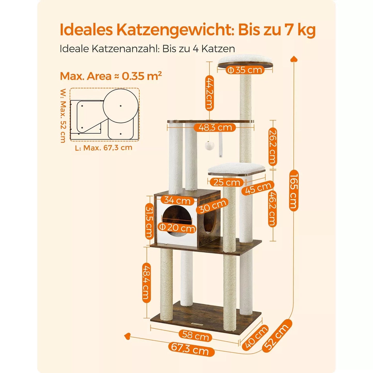 Produktdetails: Farbe: Vintage-Braun Material: Spanplatte, 500 g/m Plüsch, Sisal Maße: 58 x 40 x 165 cm (L x B x H) Gewicht: 14,4 kg Lieferumfang: 1 x Kratzbaum 1 x Zubehörpaket 1 x Kippschutz 1 x Anleitung Hinweise: Wenn Ihr pelziger Freund anfängt, den Bommel oder das Gummiband zu kauen oder zu fressen, entfernen Sie sie und bewahren Sie sie für eine Weile außerhalb der Reichweite Ihres pelzigen Freundes auf. Da Katzen gerne springen und spielen, können Sie den Kratzbaum zur sicheren Verwendung mit dem mitgelieferten Anti-Kipp-Set an der Wand befestigen.