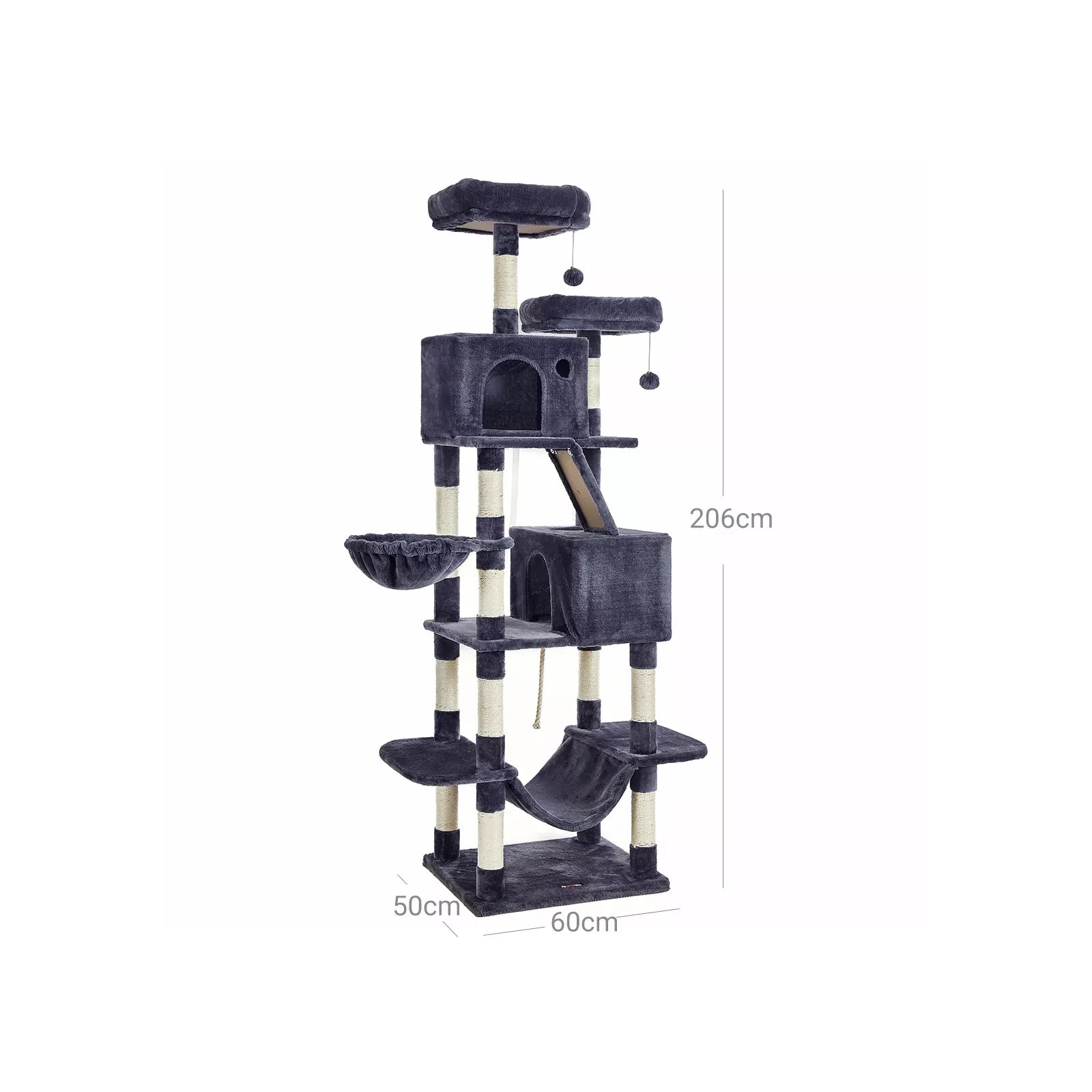In den Kreativwerkstätten von InAndOutdoorMatch springen zwei süße Kätzchen herum, begutachten alle Kratzbäume persönlich und geben ihr tierisches Feedback. So erfahren die Designer von InAndOutdoorMatch aus erster Hand, ob die Produkte den Ansprüchen verwöhnter Schnurrbartträger gerecht werden. Mit diesem Kratzbaum wird Ihre Katze viel Spaß haben: 206 cm hoch, perfekt für höhenverrückte Katzen 1 Hängematte und 1 Hängematte zum Entspannen 2 gemütliche Kuschelhöhlen zum Verstecken von Sisalstämmen und 1 Kratzbrett zum Krallenschärfen 2 Aussichtsplattformen für Beobachtung 2 Haarbälle für zusätzlichen Spielspaß x Kratzbaum1 Wenn Ihre Katze auf der Fellunterlage oder dem Gummiband kaut, entfernen Sie das Spielzeug sofort und bewahren Sie es an einem für Ihre Katze unzugänglichen Ort auf.