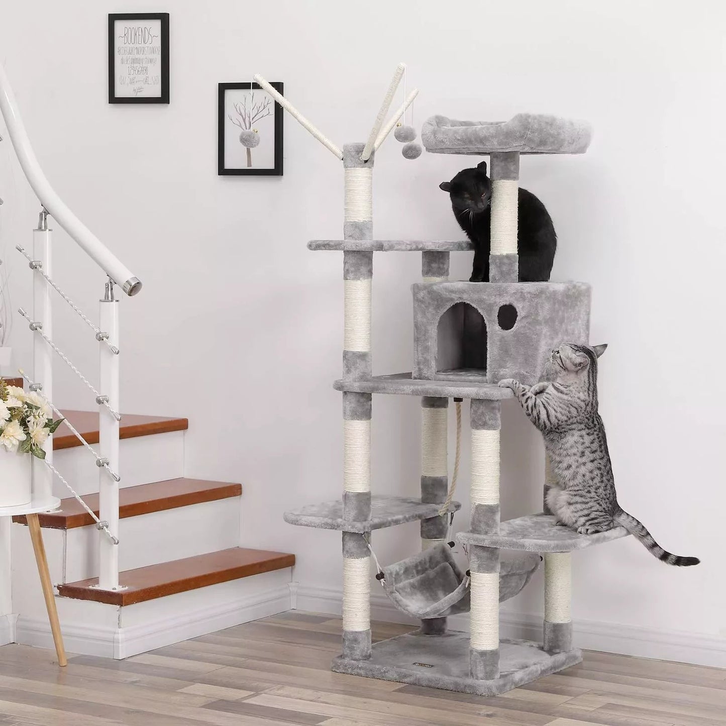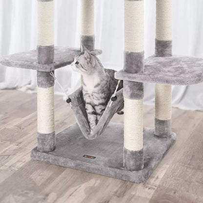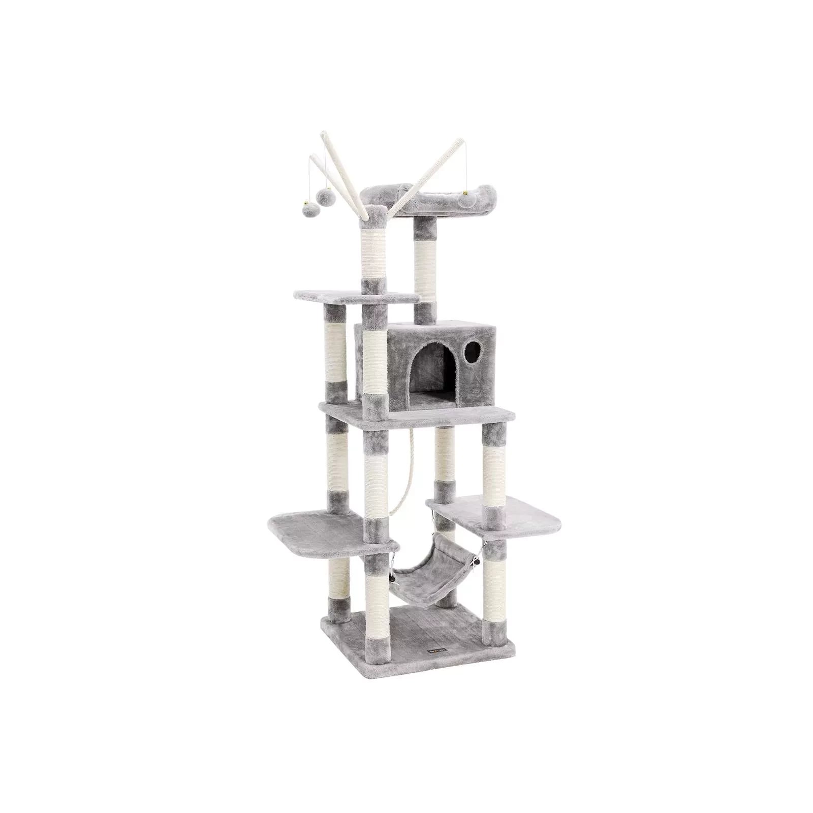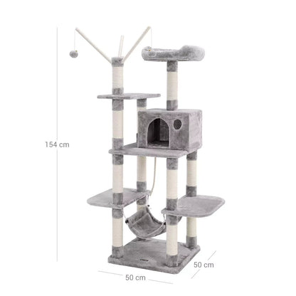 In And OutdoorMatch Luxus-Kratzbaum Iqbal – Für Katzen – 152 cm – Grau – Weiche Katzenbett-Hängematte – Katzenspielzeug – Geeignet für kleine Kätzchen