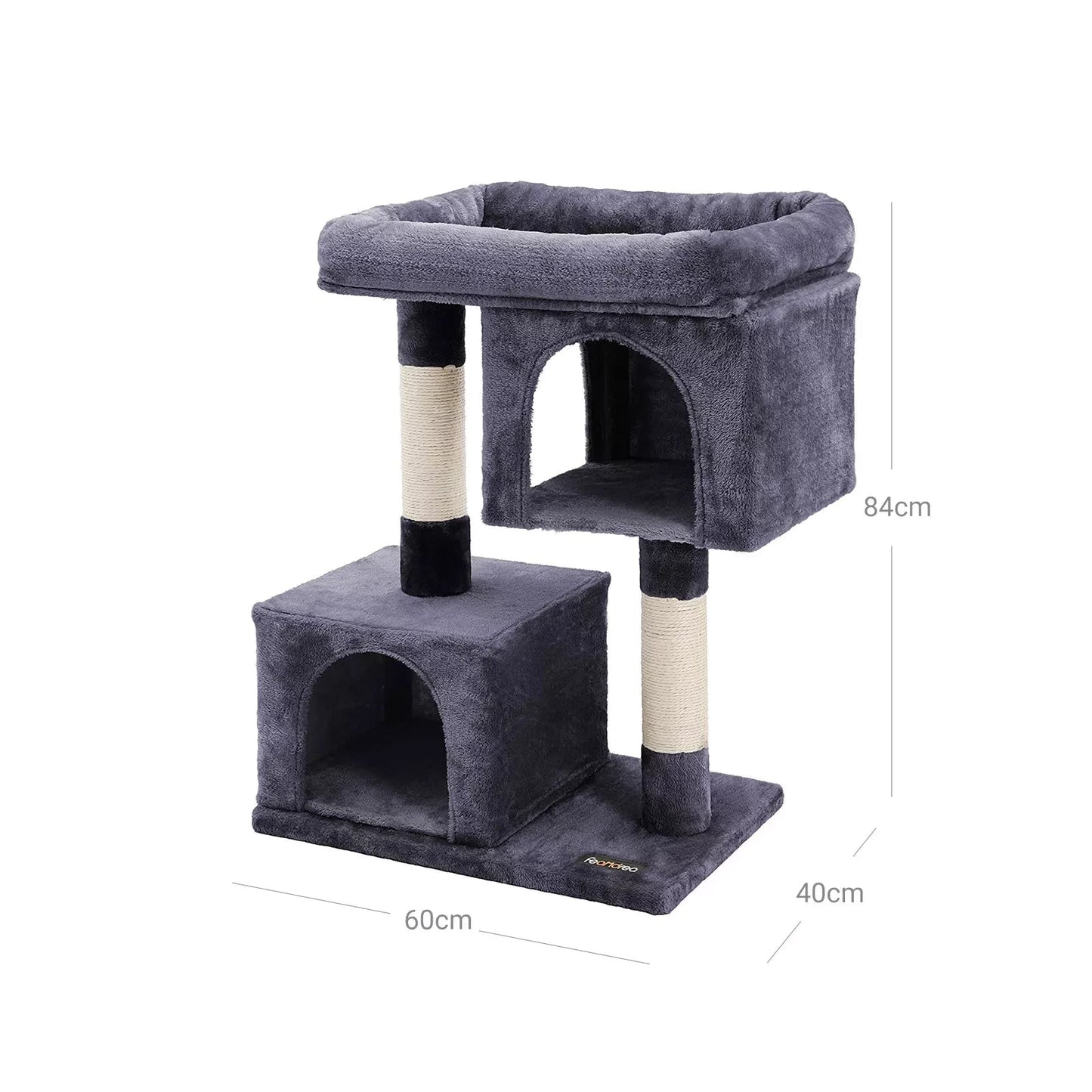 Produktdetails: - Farbe: Rauchgrau - Material: CARB-zertifizierte Spanplatte, Plüsch, Sisal - Produktmaße: 60 x 40 x 84 cm (B x T x H) - Gewicht: 10,9 kg Lieferumfang: - 1 x Kratzbaum - 1 x Anleitung (DE, EN, FR, ES, IT)