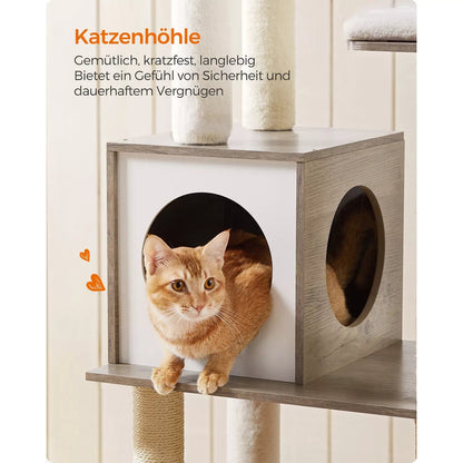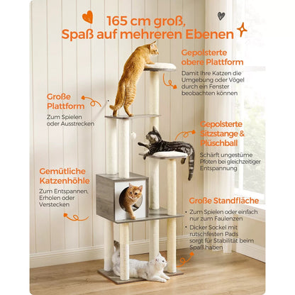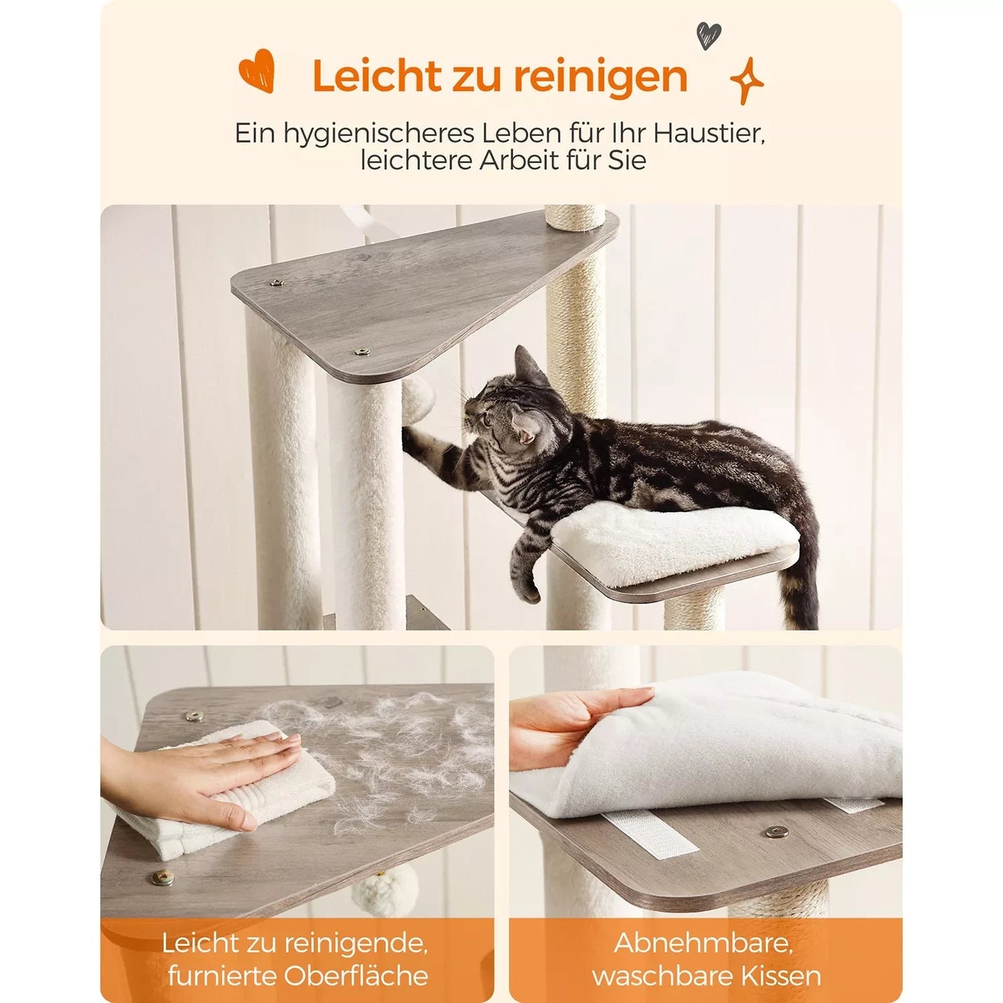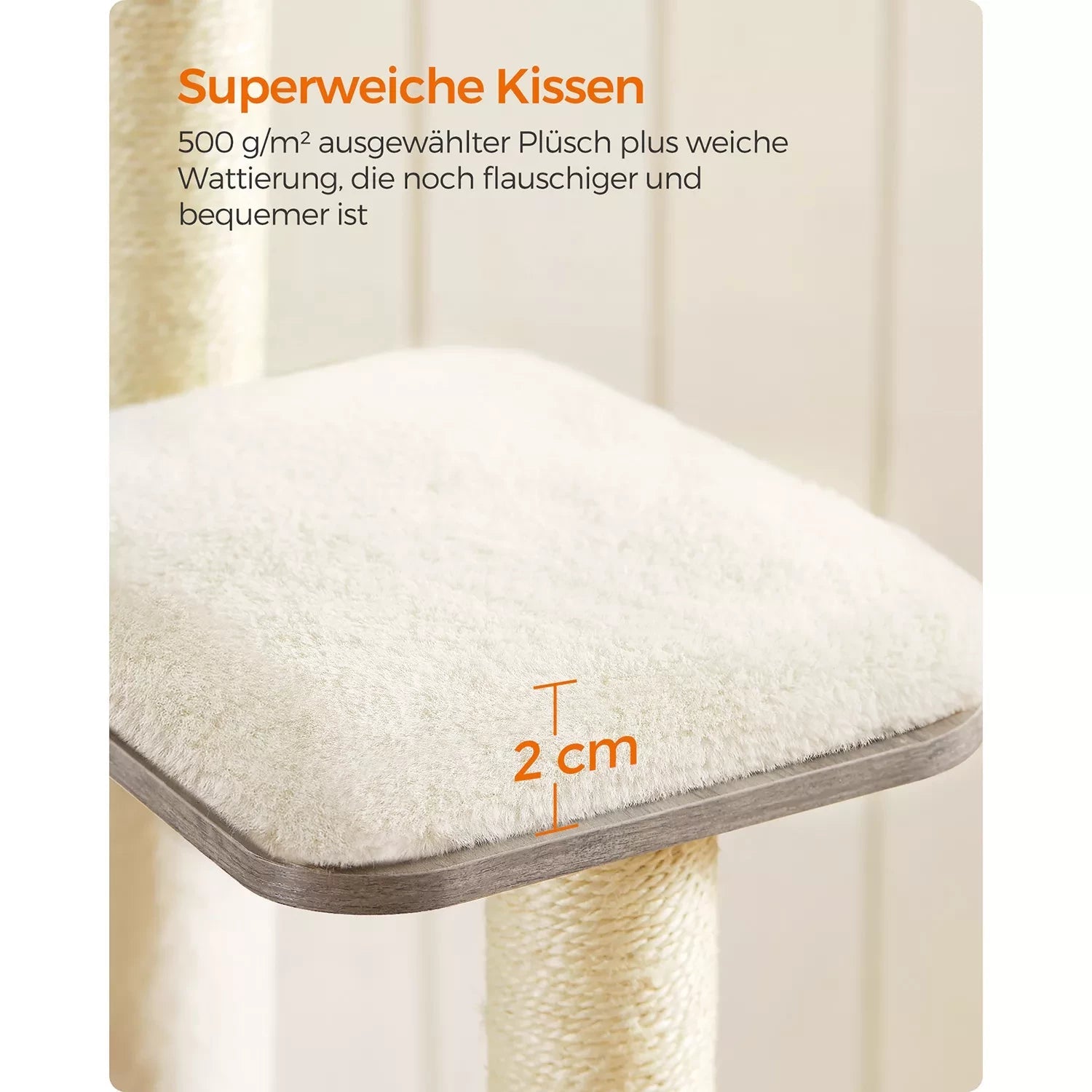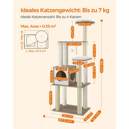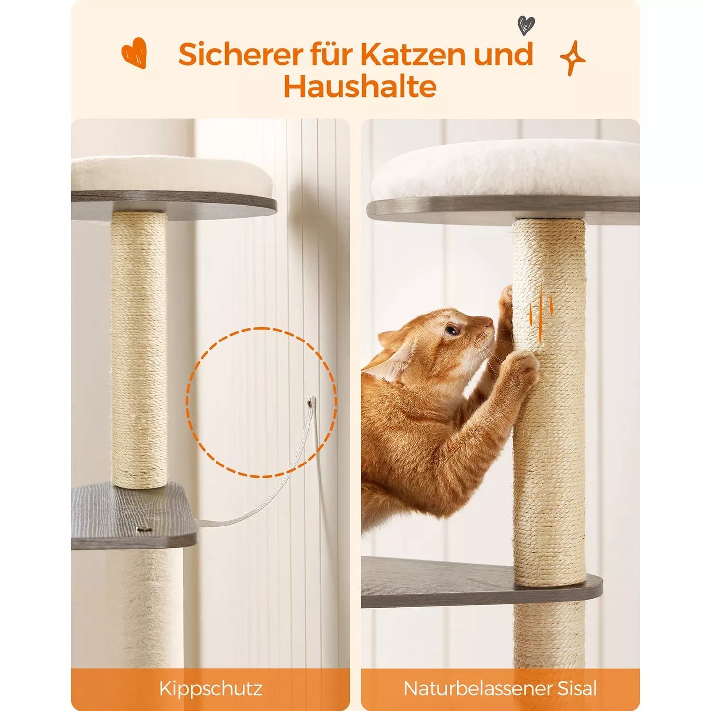 Produktdetails: Farbe: Greige Material: Spanplatte, 500 g/m Plüsch, Sisal Maße: 58 x 40 x 165 cm (L x B x H) Gewicht: 14,4 kg Lieferumfang: 1 x Kratzbaum 1 x Zubehörpaket 1 x Kippschutz 1 x Anleitung Hinweise: Wenn Ihr pelziger Freund anfängt, den Bommel oder das Gummiband zu kauen oder zu fressen, entfernen Sie diese bitte und bewahren Sie sie für eine Weile außerhalb der Reichweite Ihres pelzigen Freundes auf. Da Katzen gerne springen und spielen, können Sie den Kratzbaum zur sicheren Verwendung mit dem mitgelieferten Anti-Kipp-Set an der Wand befestigen.