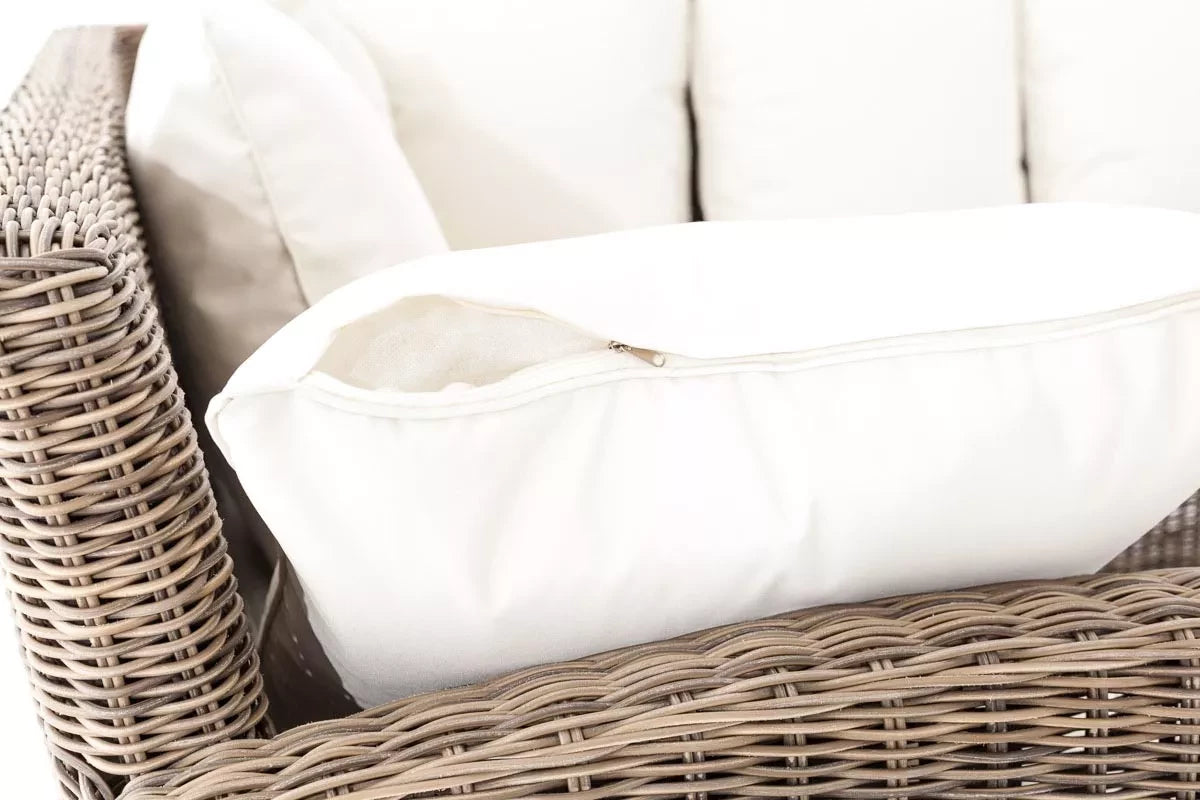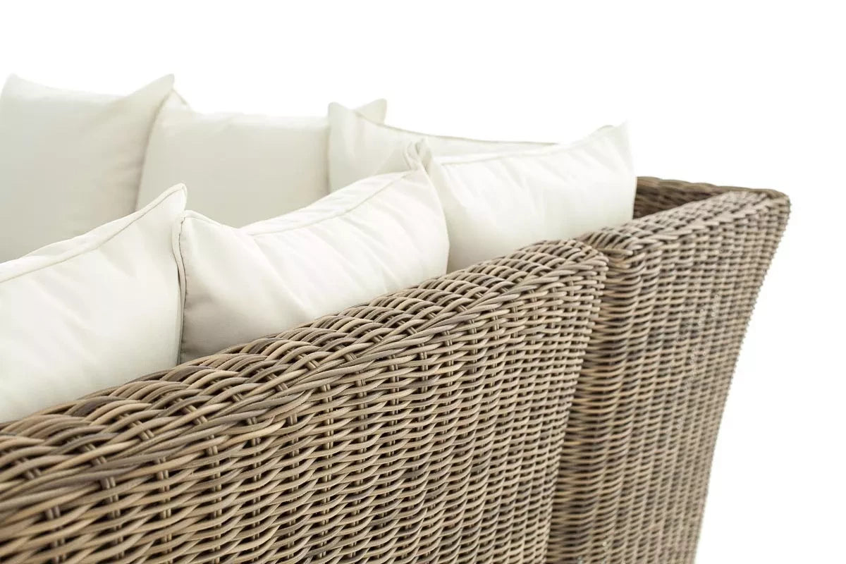 Diese exklusive Sitzgruppe wird nicht nur optisch höchsten Ansprüchen gerecht, auch die in Handarbeit verarbeiteten Materialien genügen besten Qualitätsansprüchen und sorgen für Stabilität und Langlebigkeit. Das UV-beständige Material Polyrattan, das sich besonders für den Außenbereich eignet, ähnelt herkömmlichem Rattangewebe, ist jedoch deutlich robuster. Die hochwertigen, 5 mm starken, runden Polyrattan-Fasern sind wasserfest, angenehm pflegeleicht und UV-beständig, sodass sie auch nach häufigem und längerem Gebrauch ihre Farbtiefe behalten. In Kombination mit einer hellen Struktur sorgt dieser edle Farbton für den absolut natürlichen Look dieses Möbelsets. Die bequemen 8 cm dicken Sitzkissen sind mit 100 % Polyester bezogen. Diese sind wasser- und schmutzabweisend und aufgrund ihrer hohen Strapazierfähigkeit sehr langlebig. Dank der versteckt eingenähten Reißverschlüsse lassen sich die Bezüge bei Bedarf einfach abnehmen und waschen. Das Gestell bzw. der Unterbau der einzelnen Möbelstücke besteht aus stabilem, pulverbeschichtetem Aluminium – garantiert stabil und dauerhaft rostfrei.