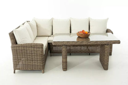 Das Sofa mit kürzerem und längerem Bein und der große Esstisch mit abwaschbarer Tischplatte passen perfekt zueinander. Auch die Abstimmung der Farben trägt zum harmonischen Gesamteindruck der Polyrattan-Möbel bei. Apropos alles: Im Lieferumfang des Sofas mit Tisch sind bereits alle Sitzkissen enthalten. Dank der leicht nach hinten geneigten und angenehm hohen Rückenlehne können Sie hier bequem sitzen, ganz nach Wunsch mit oder ohne bewegliche Rückenkissen.