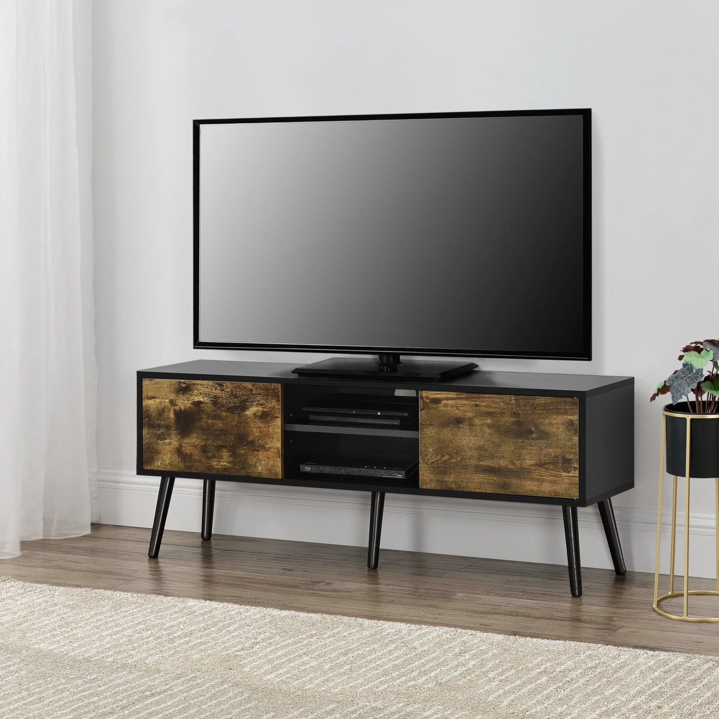 Der moderne und dekorative TV-Schrank verfügt über zwei Türen und zwei offene Fächer in der Mitte für zusätzlichen Stauraum.