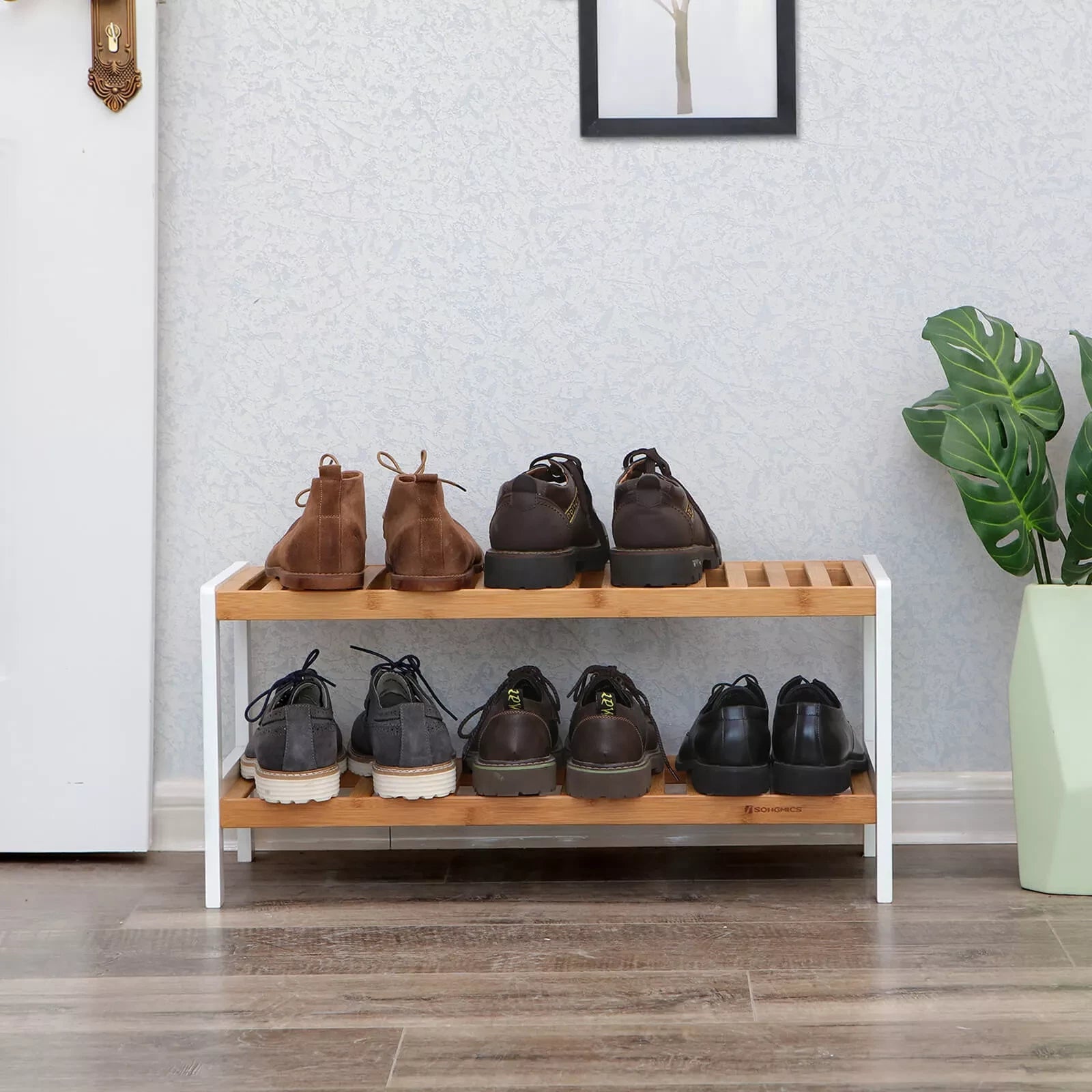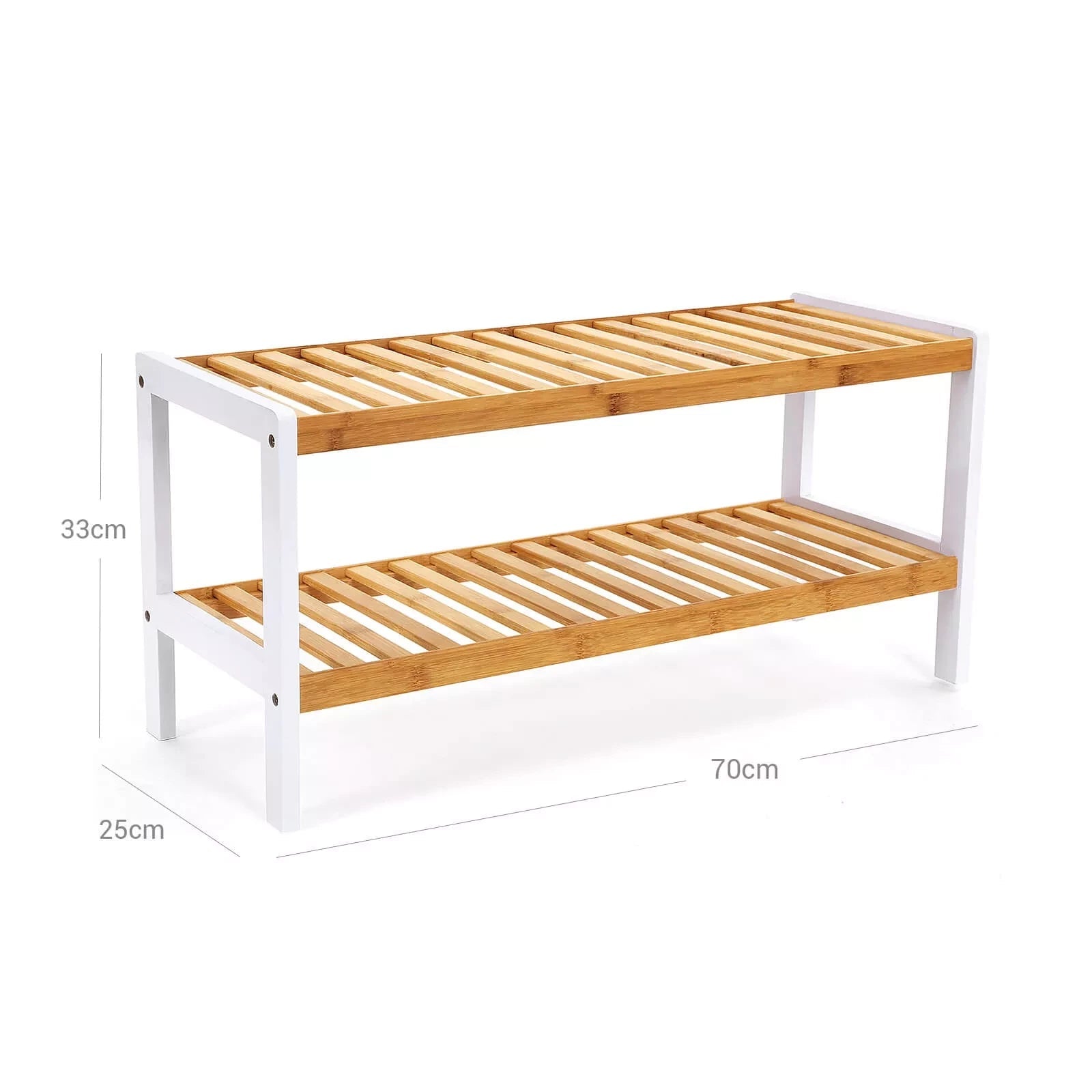 Das InAndOutdoorMatch Schuhregal ist der ideale Organizer für den Flur oder Korridor. Sie erhalten ein schickes Schuhregal, das durch gute Verarbeitung überzeugt und äußerst dekorativ ist. Es sorgt nicht nur für Ordnung in Ihrem Zuhause, Sie können es auch zur Präsentation von Schuhen und Dekorationsartikeln im Geschäft verwenden. In den 3 Ablagefächern finden Schuhe, Taschen, Pflanzen, Körbe und Badaccessoires wie Handtücher Platz. Hier sind weitere Ideen. Warum sollten Sie sich für das Schuhregal von Songmics entscheiden? Songmics ist stets kundenorientiert und setzt alles daran, qualitativ hochwertige Artikel zu einem guten Preis-Leistungs-Verhältnis zu liefern. Wir verfügen über einen hervorragenden Kundenservice und werden unser Bestes tun, um Ihre Probleme zu lösen. Hinweis: - Setzen Sie sich nicht darauf und lehnen Sie sich nicht darauf. Produktdetails: – Maße: 70 x 33 x 26 cm (B x H x T) – Material: Bambus – Verpackungsmaße: 69 x 30,5 x 7,5 cm – Gewicht: 2,5 kg Lieferumfang: – 1 x 2-lagiges Schuhregal