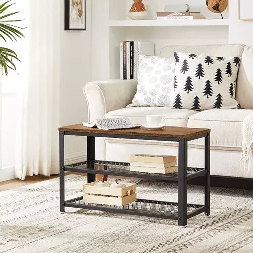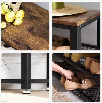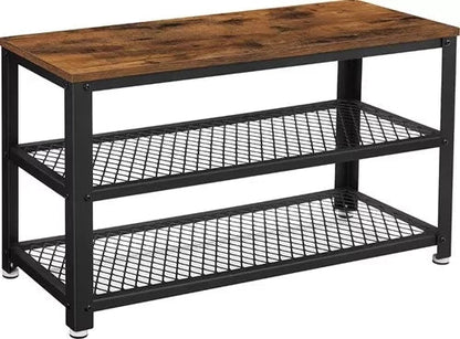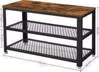 WILLKOMMEN ZU HAUSE: Ein leerer Raum fühlt sich einsam und kalt an. Dieses Schuhregal kommt gerade rechtzeitig! Vintage-Finish und schwarzer Metallrahmen. Von nun an werden Sie zu Hause mit Herzlichkeit empfangen. Ordentlich und ordentlich: Die 2 Regale (je 73 cm lang) bieten Platz für 6-8 Paar Schuhe. Platzieren Sie Ihre Taschen oder Dekorationsgegenstände auf der obersten Ablage und sorgen Sie für einen aufgeräumten Eingangsbereich! LANGLEBIGES DESIGN: Diese robuste Schuhbank besteht aus hochfester Spanplatte und Metall und ist bis zu 90 kg belastbar. Setzen Sie sich und ziehen Sie Ihre Schuhe an oder warten Sie auf Ihren Freund. ABMESSUNGEN: 73x30x45 cm