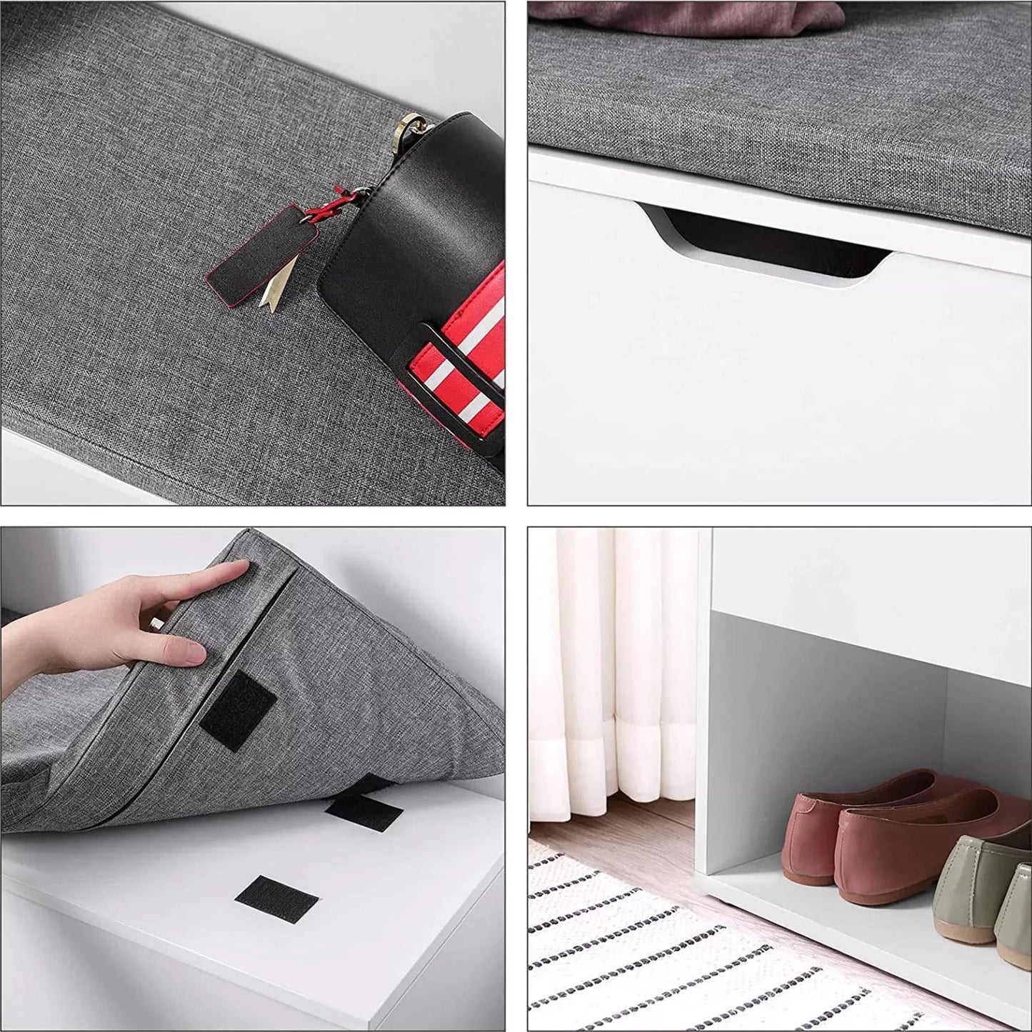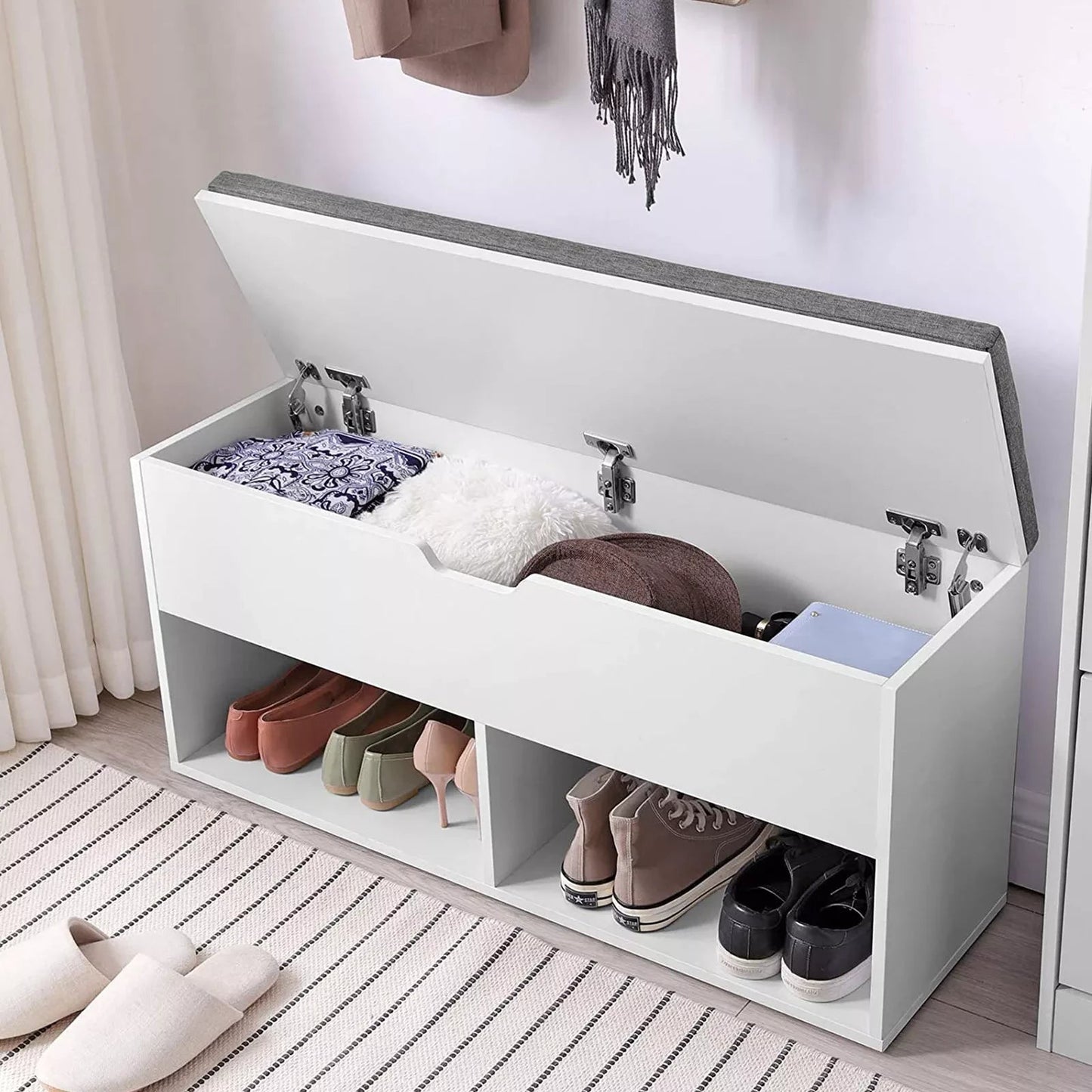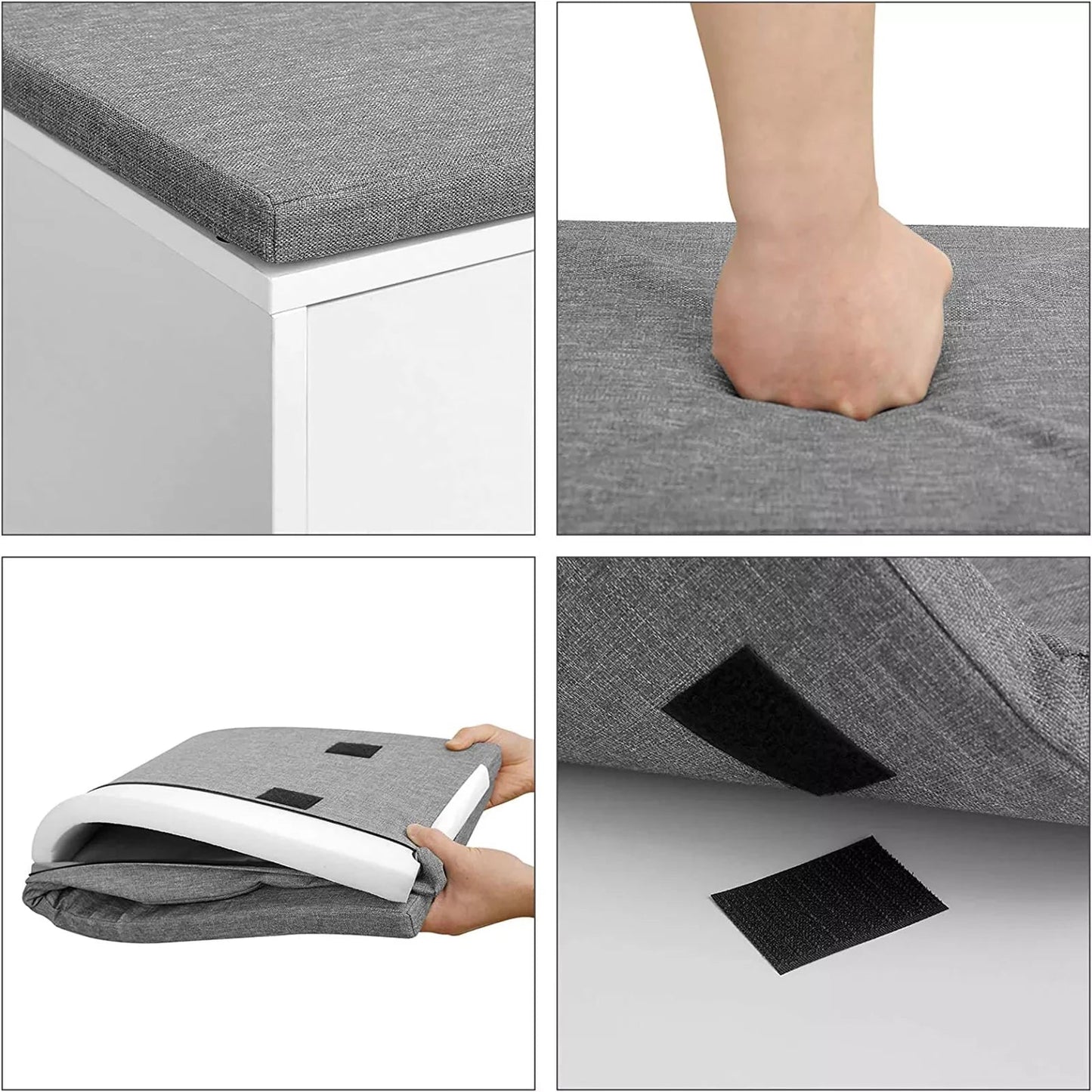 Ein optimaler Sitzplatz Anstatt auf einem Bein durch die Wohnung zu hüpfen, um die Schuhe anzuziehen, oder unbequem auf dem Boden zu hocken, ist es sicherlich bequemer, auf dieser gepolsterten Bank zu sitzen und in aller Ruhe die Turnschuhe anzuziehen. Diese Schuhbank besteht aus verschleißfestem Holz der Güteklasse E1 und ist mit einer gut gepolsterten Sitzfläche ausgestattet, die Ihnen einen starken und bequemen Halt bietet. Macht das Beste aus kleinen Räumen Kompakt und dennoch geräumig! Mit dieser 100 x 30 x 48 cm großen Schuhbank können Sie Ihre Sachen organisieren und das Chaos im Zaum halten. Sie können sie im Flur, im Wohnzimmer, im Kinderzimmer oder am Fußende Ihres Bettes platzieren, um Schuhe, Zeitungen, Taschen und Spielzeug aufzubewahren. Produktdetails: - Farbe: Weiß, Sitzbezug in Grau - Material: Spanplatte der Klasse E1, Schaumstoffpolsterung, Sitzbezug aus Leinenimitat - Maße: 100 x 30 x 48 cm (L x B x H) - Gewicht: 16,5 kg - Max. statische Belastbarkeit: 200 kg Lieferumfang: - 1 x Schuhbank - 1 x Zubehörpaket - 1 x Anleitung (DE, EN, FR, ES, IT)